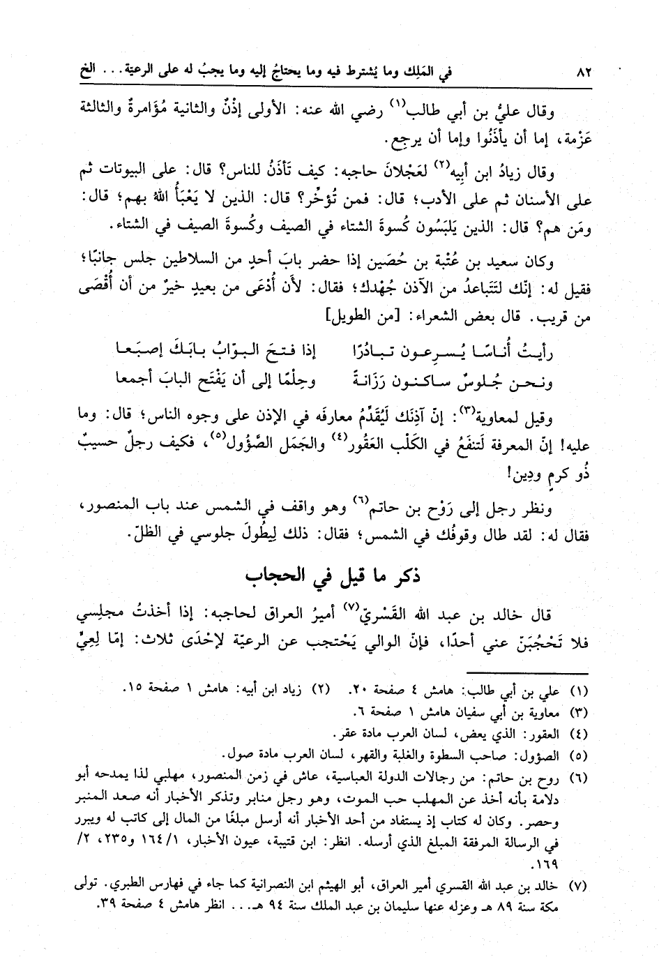قال خالد بن عبد الله القسري أمير العراق لحاجبه : إذا أخذت مجلسي فلا تحجبن عني أحدا ، فإن الوالي يحتجب عن الرعية لإحدى ثلاث : إما لعي