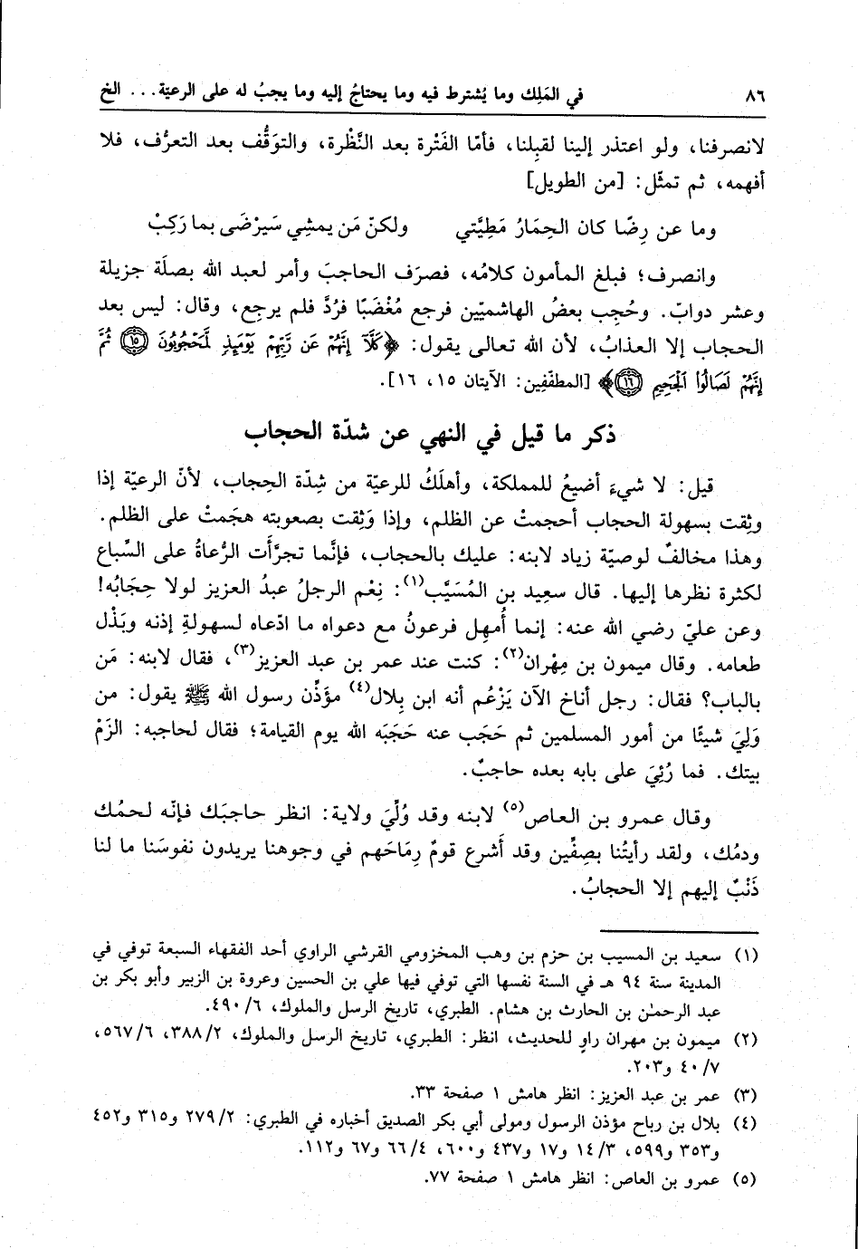 قال سعيد بن المسيب : نعم الرجل عبد العزيز لولا حجابه وعن علي رضي الله عنه : إنما أمهل فرعون مع دعواه ما ادعاه لسهوله إذنه وبذل طعامه .