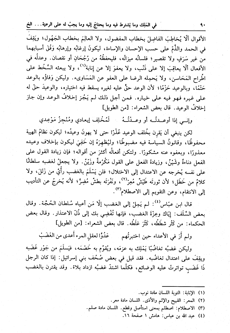 ولا يجعل لغضبه سلطانا على نفسه يخرجه عن الاعتدال إلى الاختلال ؛ فلن يسلم بالغضب رأيٌ من زلل ، ولا كلامٌ من خطل ؛ لأن ثورته طيشٌ معرّ ، ونفرته بطشٌ مضرٌّ ؛ لأنه يخرج عن التأدب إلى الانتقام ، وعن التقويم إلى الاصطلام .