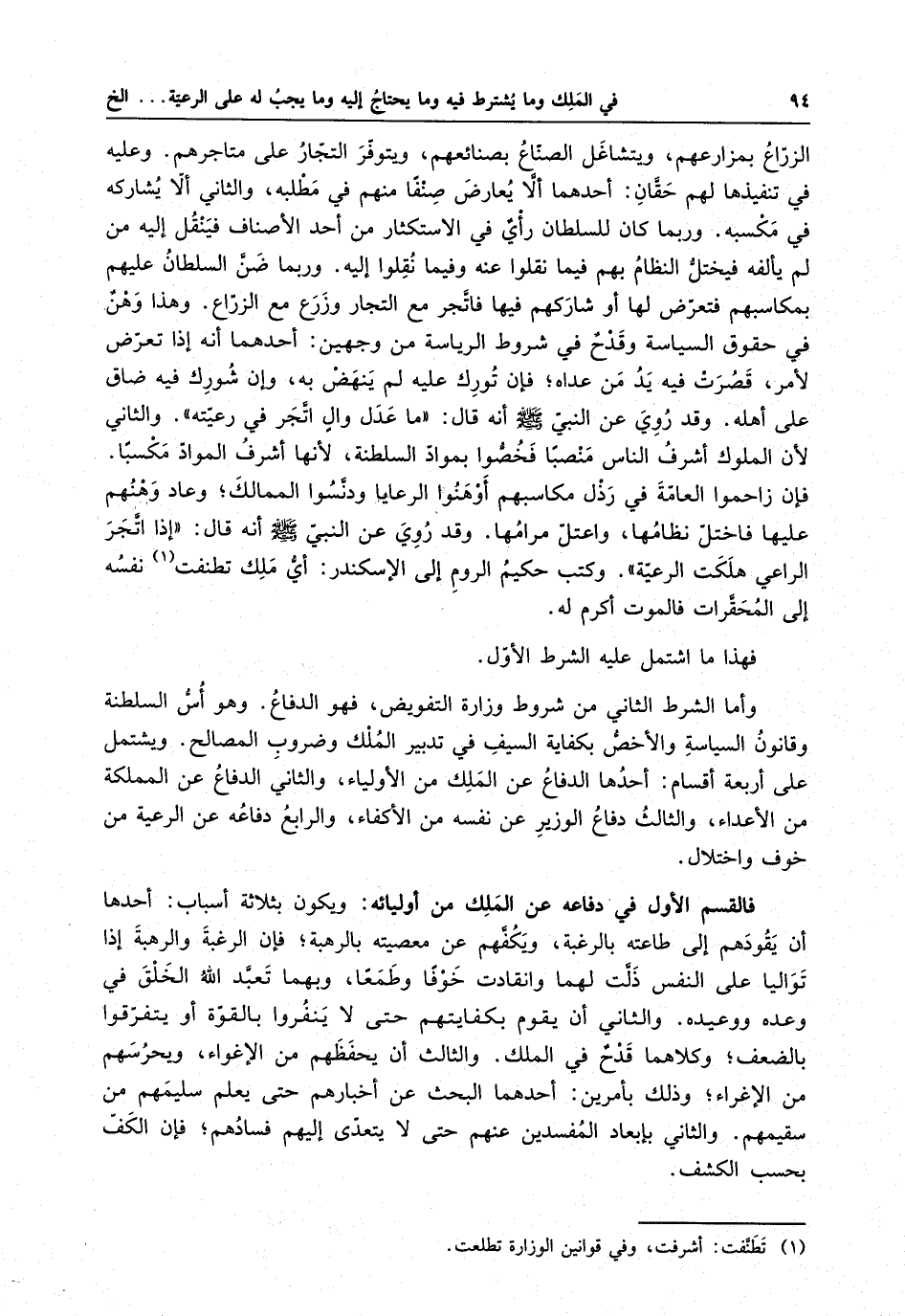 ويشتمل على أربعة أقسام : أحدها الدفاع عن الملك من الأولياء ، والثاني الدفاع عن المملكة من الأعداء ، والثالث دفاع الوزير عن نفسه من الأكفاء ، والرابع دفاعه عن الرعية من خوف واختلال .