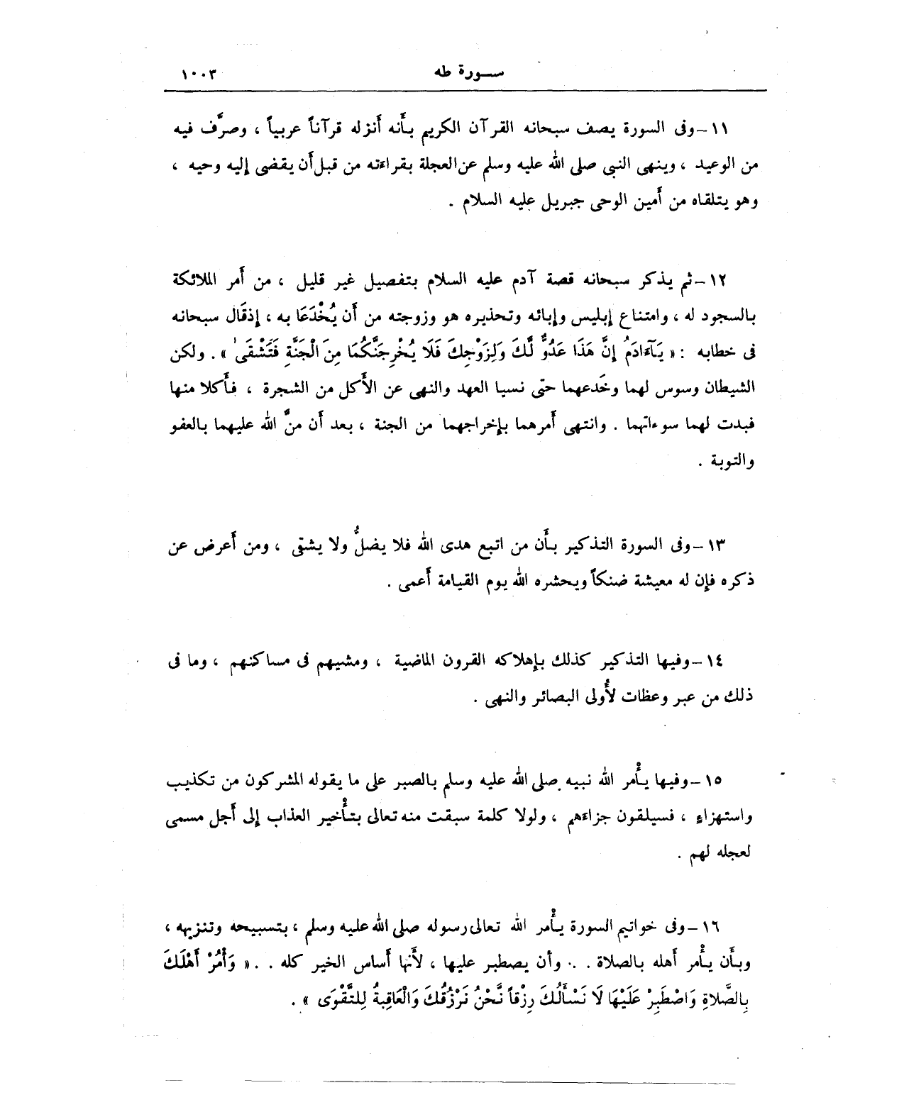 12 - ثم يذكر سبحانه قصة آدم عليه السلام بتفصيل غير قليل، من أمر الملائكة بالسجود له، وامتناع إبليس وإِبائه وتحذيره هو وزوجته من أَن يُخْدَعَا به، إذ قَال سبحانه في خطابه: {فَقُلْنَا يَا آدَمُ إِنَّ هَذَا عَدُوٌّ لَكَ وَلِزَوْجِكَ فَلَا يُخْرِجَنَّكُمَا مِنَ الْجَنَّةِ فَتَشْقَى}. ولكن الشيطان وسوس لهما وخَدعهما حتى نسيا العهد والنهي عن الأَكل من الشجرة، فأكلا منها فبدت لهما سوءاتهما. وانتهى أَمرهما بإخراجهما من الجنة، بعد أن منَّ الله عليهما بالعفو والتوبة.