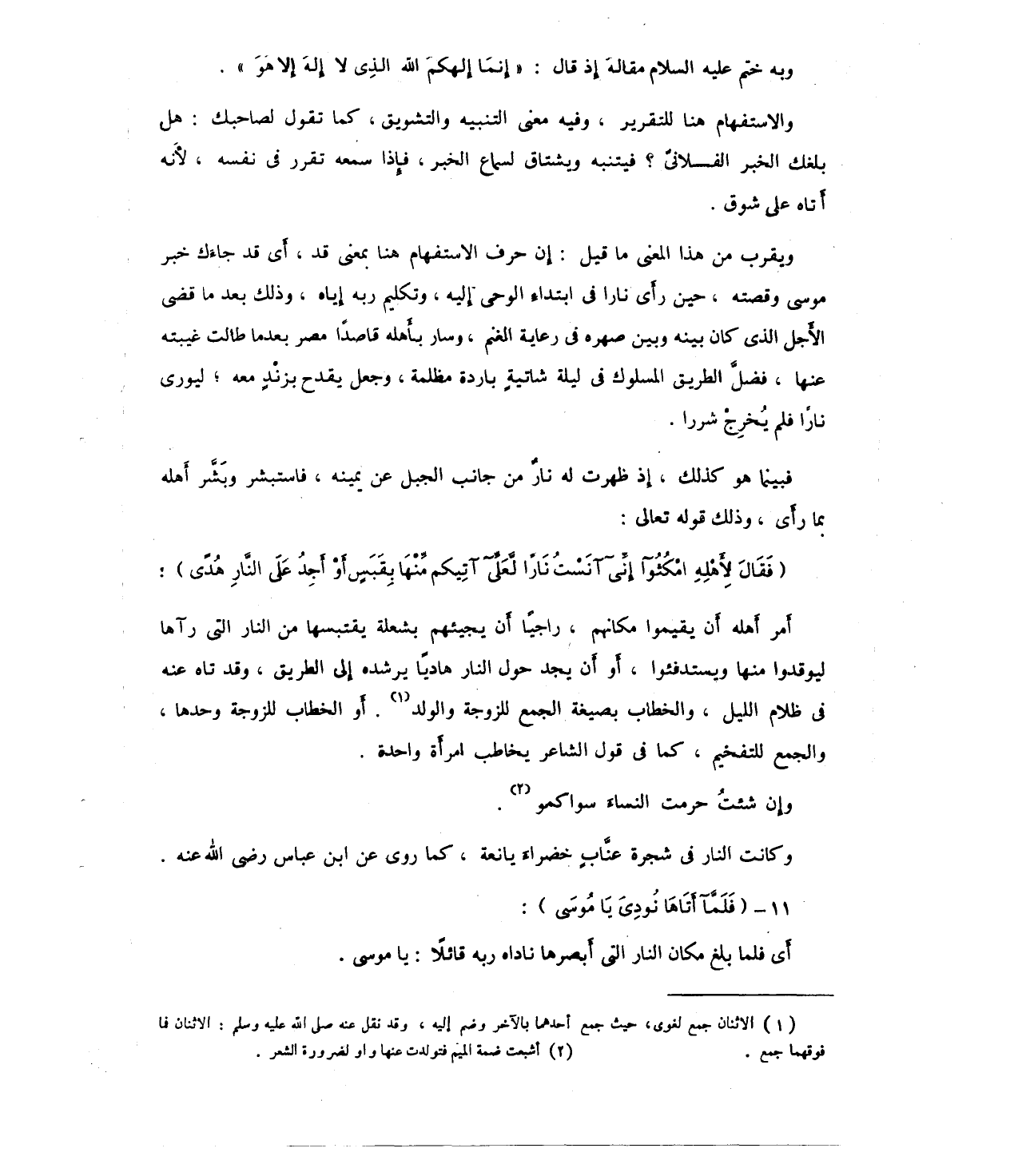 أَمر أَهله أَن يقيموا مكانهم، راجيًا أن يجيئهم بشعلة يقتبسها من النار التي رآها ليوقدوا منها ويستدفئوا، أَو أن يجد حول النار هاديًا يرشد إلى الطريق، وقد تاه عنه في ظلام الليل، والخطاب بصيغة الجمع للزوجة والولد (¬1). أَو الخطاب للزوجة وحدها، والجمع للتفخيم، كما في قول الشاعر يخاطب امرأَة واحدة.