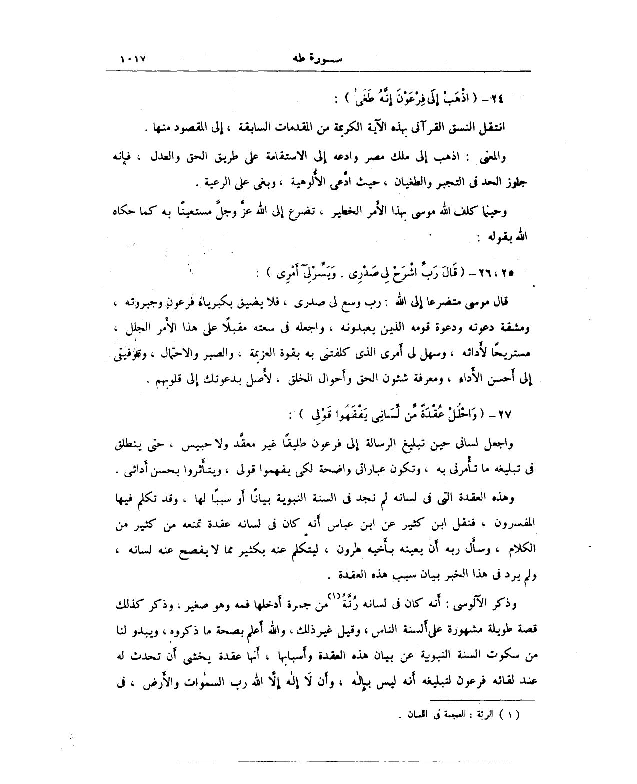 وذكر الآلوسى: أنه كان في لسانه رُتَّةُ (¬1) من جمرة أدخلها فمه وهو صغير، وذكر كذلك قصة طويلة مشهورة على ألسنة الناس، وقيل غير ذلك، والله أعلم بصحة ما ذكروه، ويبدو لنا من سكوت السنة النبوية عن بيان هذه العقدة وأسبابها، أنها عقدة يخشى أَن تحدث له عند لقائه فرعون لتبليغه أنه ليس بإله، وأن لَا إله إلاَّ الله رب السماوات والأرض، في