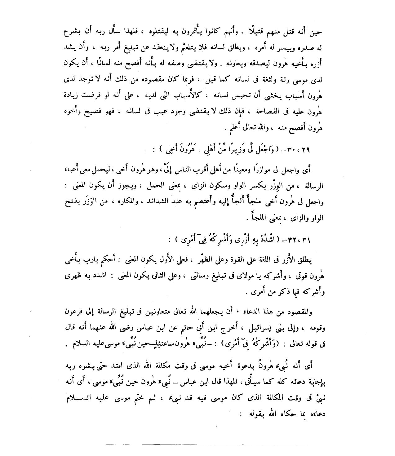 حين أَنه قتل منهم قتيلًا، وأنهم كانوا يأْتمرون به ليقتلوه، فلهذا سأل ربه أنا يشرح له صدره وييسر له أمره، ويطلق لسانه فلا يتلعثم ولا ينعقد عن تبليغ أَمر ربه، وأن يشد أزره بأخيه هارون ليصدقه ويعاونه. ولا يقتضي وصفه له بأَنه أفصح منه لسانًا، أن يكون لدى موسى رتة ولثغة في لسانه كما قيل، فربما كان مقصوده من ذلك أنه لا توجد لدى هارون أسباب يخشى أَن تحبس لسانه، كالأسباب التي لديه، على أَنه لو فرضت زيادة هارون عليه في الفصاحة، فإِن ذلك لا يقتضي وجود عيب في لسانه، فهو فصيح وأَخوه هارون أَفصح منه، والله تعالى أعلم.