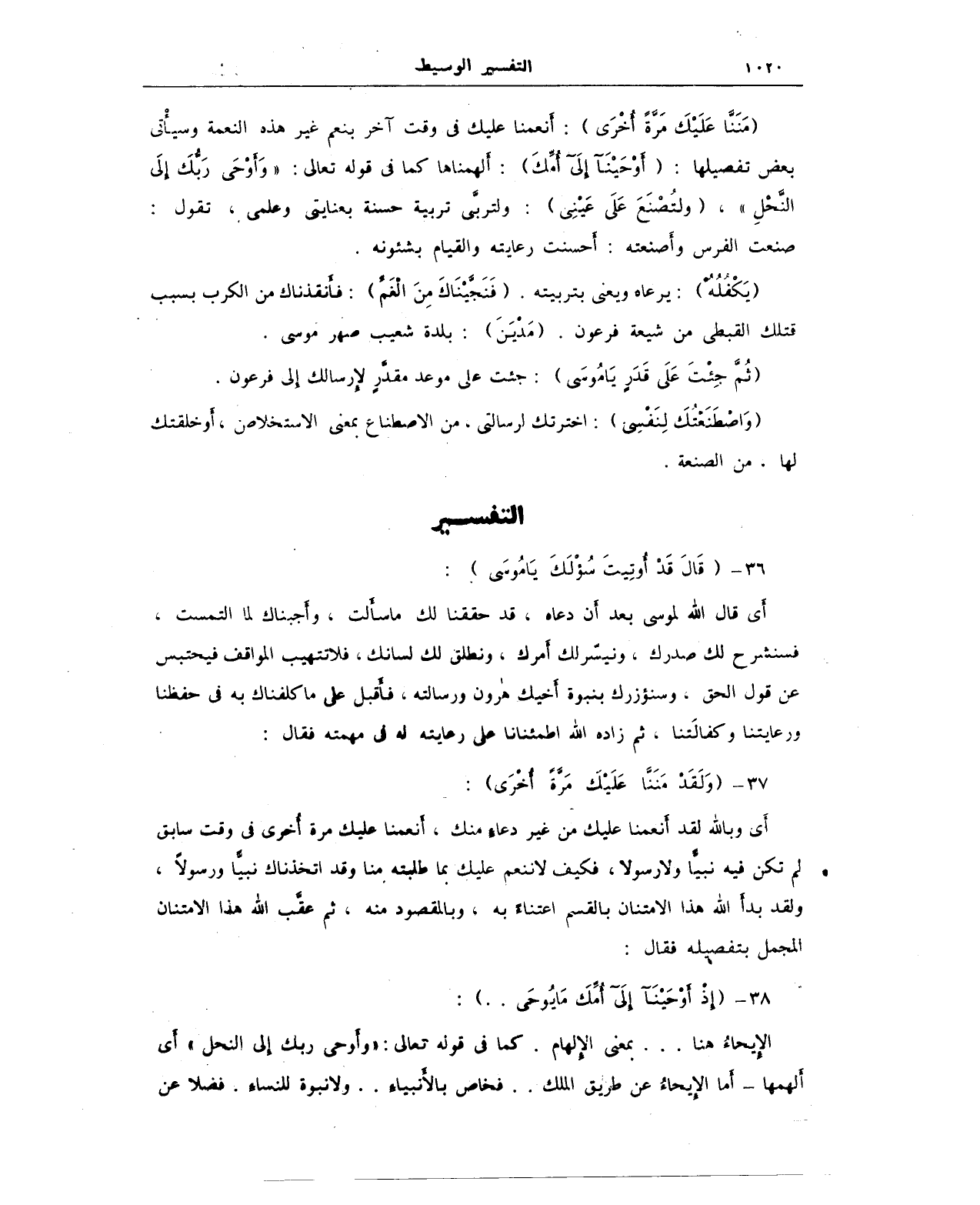 {مَنَنَّا عَلَيْكَ مَرَّةً أُخْرَى}: أَنعمنا عليك في وقت آخر بنعم غير هذه النعمة وسيأْتي بعض تفصيلها: {أَوْحَيْنَا إِلَى أُمِّكَ}: ألهمناها كما في قوله تعالى: {وَأَوْحَى رَبُّكَ إِلَى النَّحْلِ}، {وَلِتُصْنَعَ عَلَى عَيْنِي}: ولتربَّى تربية حسنة بعنايتى وعلمى، تقول: صنعت الفرس وأَصنعته: أحسنت رعايته والقيام بشئونه.