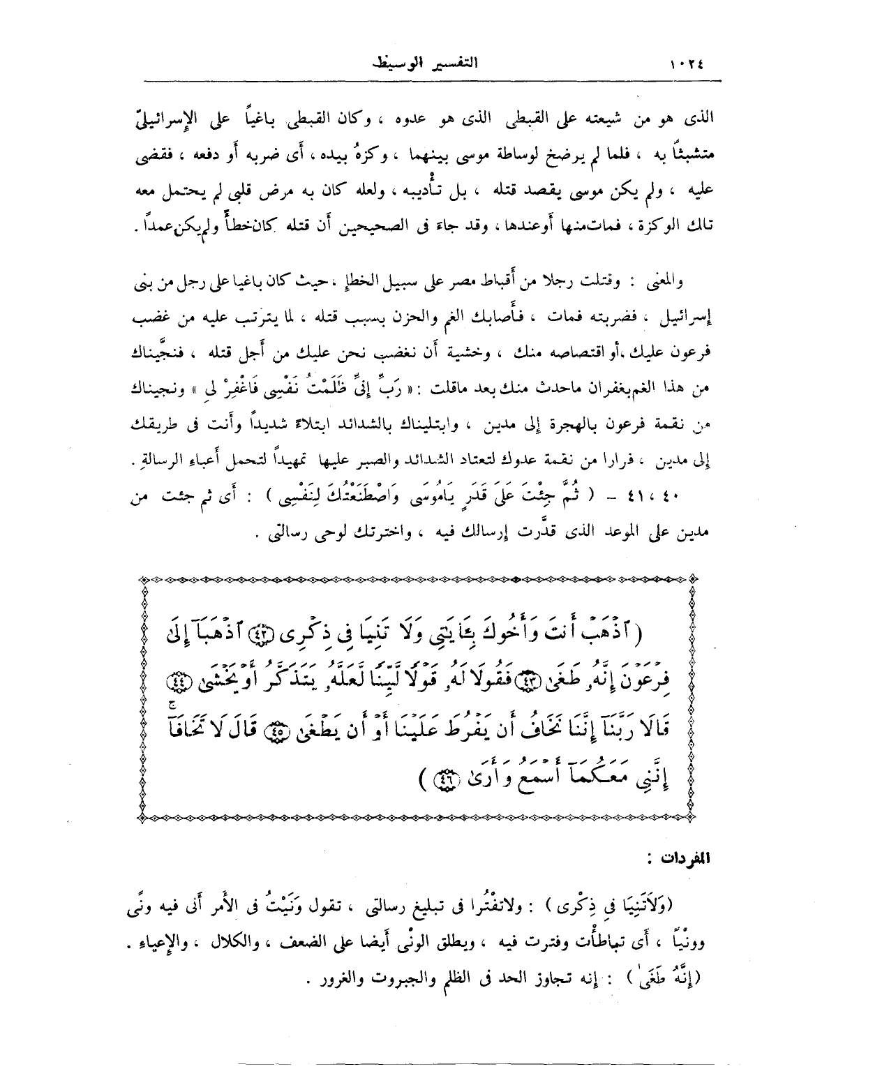 والمعنى: وقتلت رجلا من أَقباط مصر على سبيل الخطإِ، حيث كان باغيا على رجل من بني إِسرائيل، فضربته فمات، فأَصابك الغم والحزن بسبب قتله، لما يترتب عليه من غضب فرعون عليك، أو اقتصاصه منك، وخشية أَن نغضب نحن عليك من أَجل قتله، فنجَّيناك من هذا الغم بغفران ما حدث منك بعد ما قلت: {رَبِّ إِنِّي ظَلَمْتُ نَفْسِي فَاغْفِرْ لِي} ونجيناك من نقمة فرعون بالهجرة إِلى مدين، وابتليناك بالشدائد ابتلاءً شديدًا وأَنت في طريقك إِلى مدين، فرارًا من نقمة عدوك لتعتاد الشدائد والصبر عليها تمهيدًا لتحصل أَعباءِ الرسالةِ.