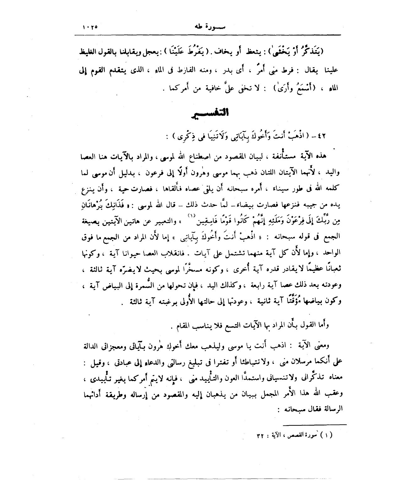 ومعنى الآية: اذهب أَنت يا موسى وليذهب معك أخوك هارون بآياتى ومعجزاتى الدالة على أَنكما مرسلان مني، ولا تتباطئا أَو تفترا في تبليغ رسالتى والدعاء إلى عبادتى، وقيل: معناه تذكَّرانى ولا تنسياني واستمدَّا العون والتأْييد مني، فإنه لا يتم أَمركما بغير تأييدى، وعقب الله هذا الأَمر المجمل ببيان من يذهبان إِليه والمقصود من إرساله وطريقة أدائهما الرسالة فقال سبحانه: