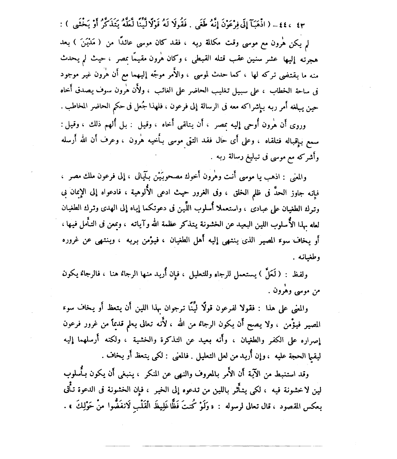 والمعنى على هذا: فقولا لفرعون قولًا ليِّنًا ترجوان بهذا اللين أَن يتعظ أو يخاف سوءَ المصير فيؤْمن، ولا يصح أَن يكون الرجاءُ من الله، لأنه تعالى يعلم قديمًا من غرور فرعون إصراره على الكفر والطغيان، وأنه بعيد عن التذكرة والخشية، ولكنه أرسلهما إليه ليقيما الحجة عليه، وإن أُريد من لعل التعليل. فالمعنى: لكي يتعظ أَو يخاف.