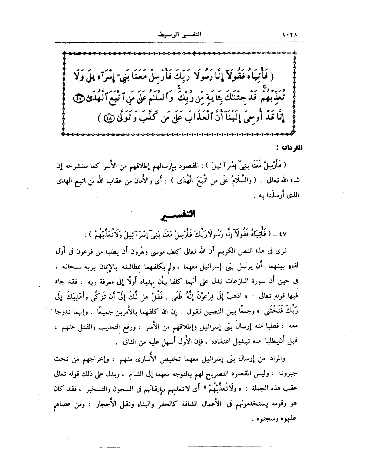 {فَأَرْسِلْ مَعَنَا بَنِي إِسْرَائِيلَ}: المقصود بإرسالهم إطلاقهم من الأسر كما سنشرحه إن شاءَ الله تعالى. {والسَّلَامُ علَى من اتَّبَعَ الهُدَى): أي والأمان من عقاب الله لمن أتبع الهدى الذي أَرسلَنا به.