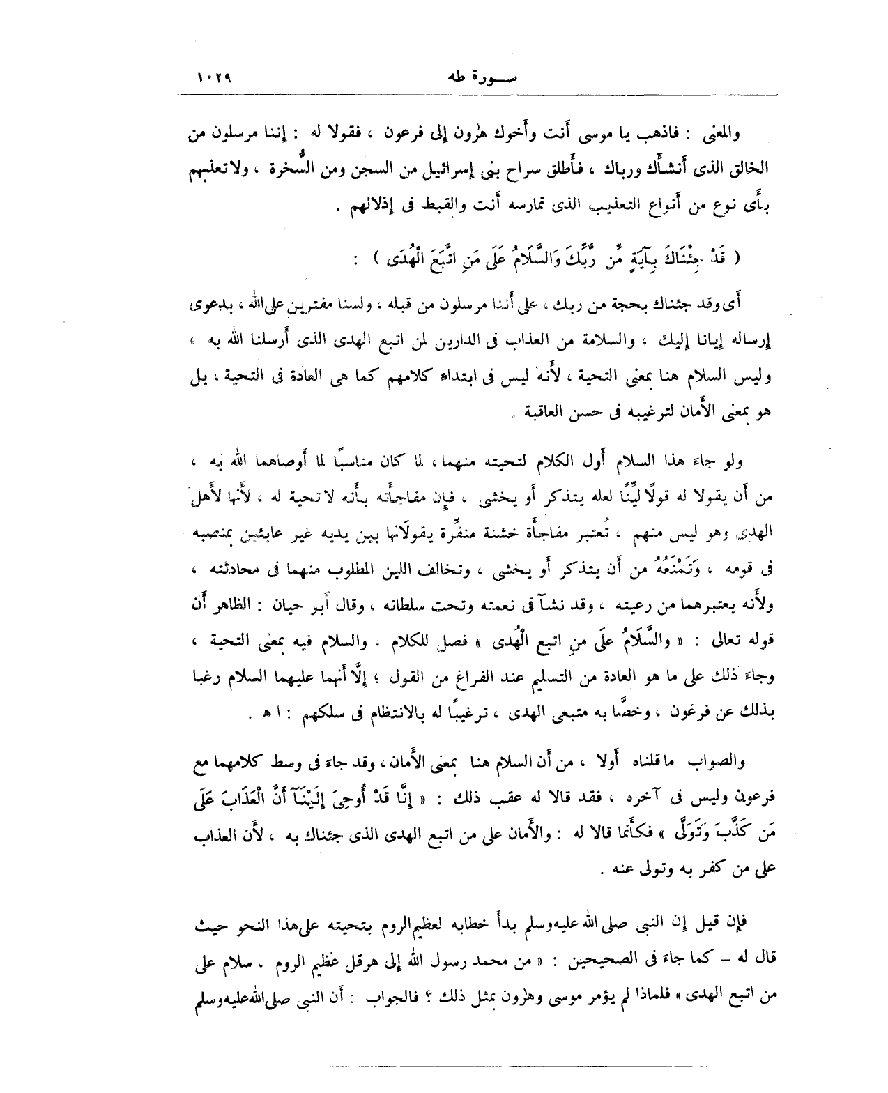 فإن قيل إِن النبي - صلى الله عليه وسلم - بدأَ خطابه لعظيم الروم بتحيته على هذا النحو حيث قال له - كما جاءَ في الصحيحين: "من محمد رسوك الله إلى هرقل عظيم الروم، سلام علي من اتبع الهدى" فلماذا لم يؤمر موسى وهارون بمثل ذلك؟ فالجواب: أَن النبي - صلى الله عليه وسلم