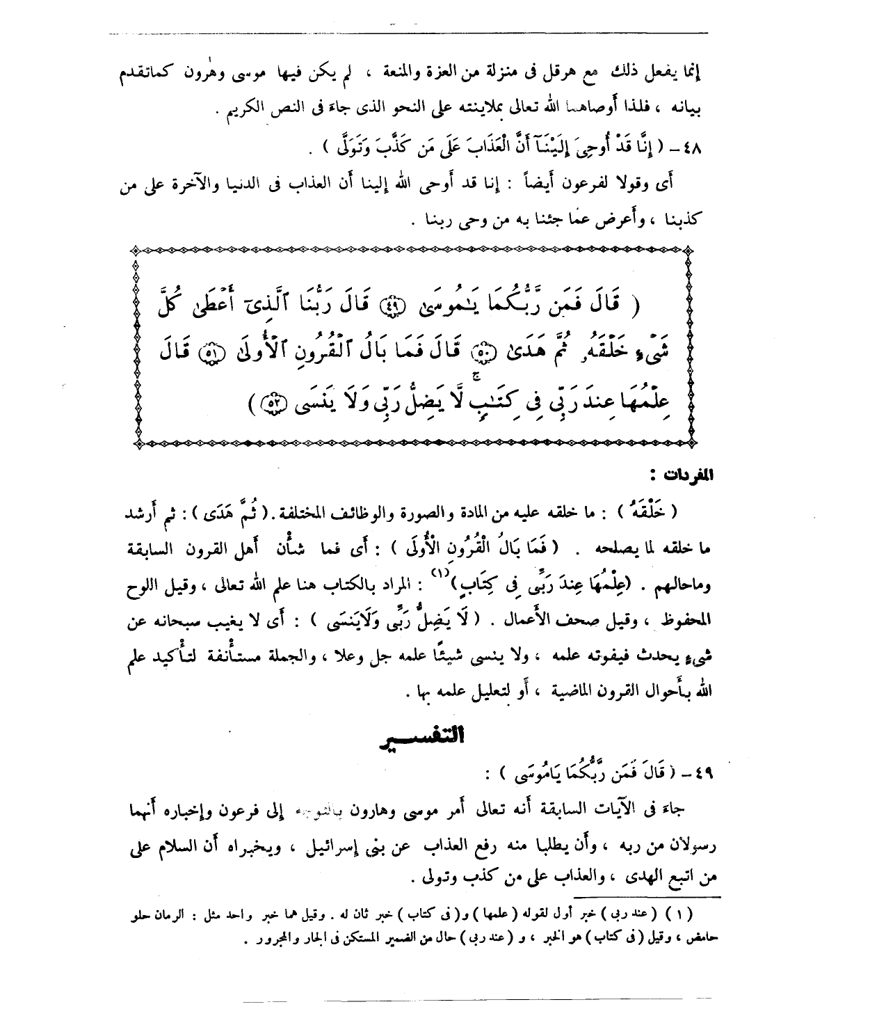 {قَالَ فَمَنْ رَبُّكُمَا يَا مُوسَى (49) قَالَ رَبُّنَا الَّذِي أَعْطَى كُلَّ شَيْءٍ خَلْقَهُ ثُمَّ هَدَى (50) قَالَ فَمَا بَالُ الْقُرُونِ الْأُولَى (51) قَالَ عِلْمُهَا عِنْدَ رَبِّي فِي كِتَابٍ لَا يَضِلُّ رَبِّي وَلَا يَنْسَى}