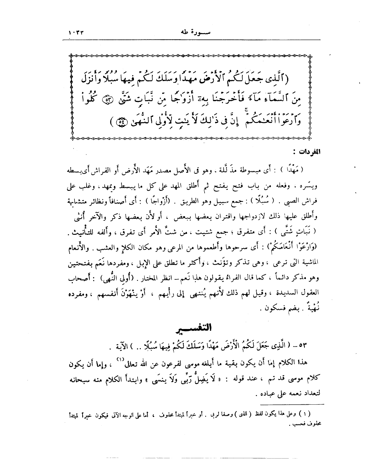 (مَهْدًا): أي مبسوطة مذَلَّلة، وهو في الأصل مصدر مَهَد الأرض أو الفراش أَي بسطه ويسّره. وفعله من باب فتح يفتح ثم أَطلق المهد على كل ما يبسط ويمهد، وغلب على فراش الصبى. (سُبُلًا): جمع سبيل وهو الطريق. (أَزْواجًا): أي أصنافًا ونظائر متشابهة وأطلق عليها ذلك لازدواجها واقتران بعضها ببعض، أَو لأن بعضها ذكر والآخر أُنثى (نَبَاتٍ شَتَّى): أَي متفرق؛ جمع شتيت، من شتَّ الأمر أَي تفرق، وأَلفه للتأْنيث. (وَارْعَوْا أَنْعَامَكُمْ): أَي سرحوها وأَطعموها من المرعى وهو مكان الكلإِ والعشب. والأَنعام الماشية التي ترعى، وهى تذكر وتؤَنث، وأكثر ما تطلق على الإِبل، ومفردها نَعَم بفتحتين وهو مذكر دائمًا، كما قال الفراءُ يقولون هذا نَعم - انظر المختار. (لِأُولِي النُّهَى): أَصحاب العقول السديدة، وقيل لهم ذلك لأَنهم يُنتهى إلى رأْيهم، أَوْ ينْهَوْنَ أَنفسهم، ومفرده نُهْيةٌ. بضم فسكون.
