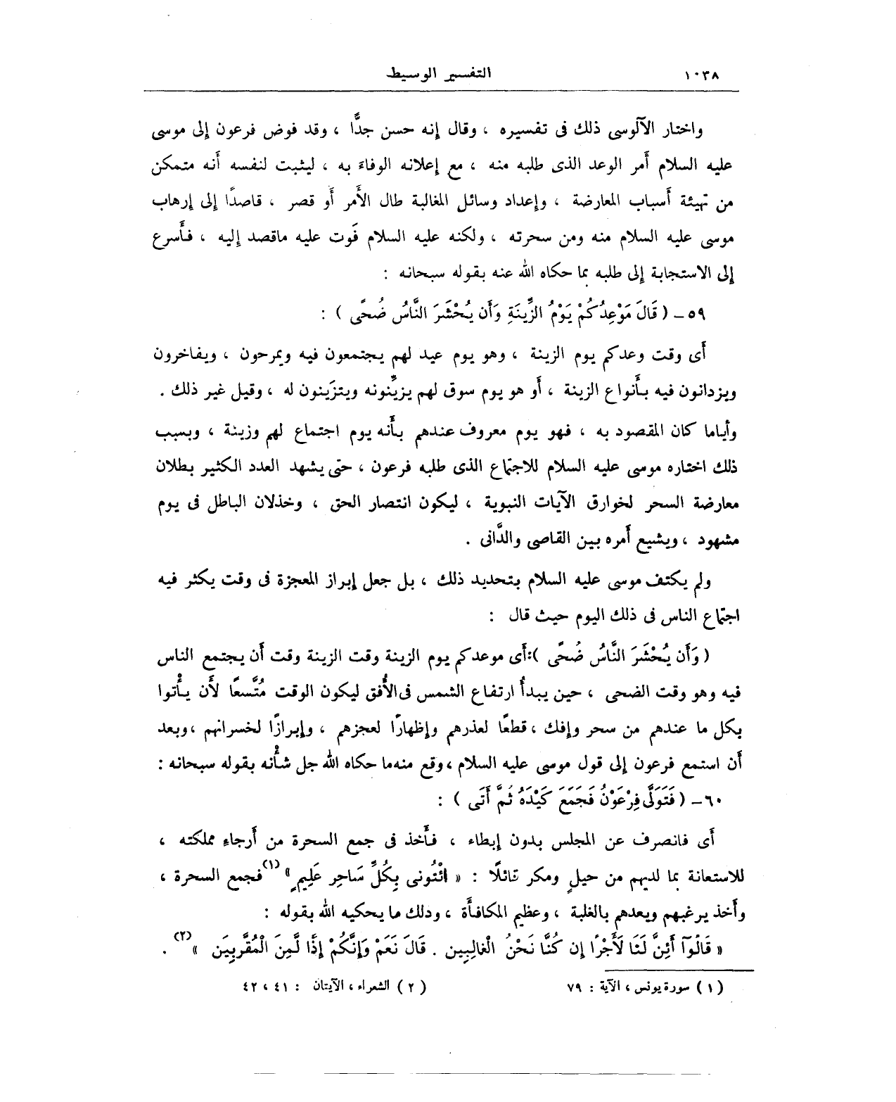 واختار الآلوسى ذلك في تفسيره، وقال إنه حسن جدًا، وقد فوض فرعون إلى موسى عليه السلام أَمر الوعد الذي طلبه منه، مع إعلانه الوفاء به، ليثبت لنفسه أَنه متمكن من تهيئة أَسباب المعارضة، وإِعداد وسائل المغالبة طال الأَمر أَو قصر، قاصدًا إِلى إِرهاب موسى عليه السلام منه ومن سحرته، ولكنه عليه السلام فَوت عليه ما قصد إِليه، فأَسرع إلى الاستجابة إِلى طلبه بما حكاه الله عنه بقوله سبحانه: