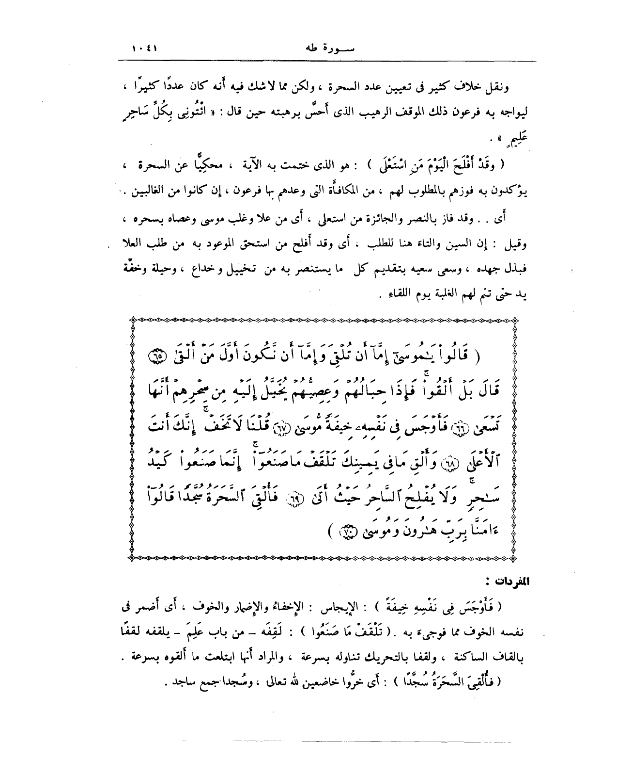 {فَأَوْجَسَ فِي نَفْسِهِ خِيفَةً}: الإيجاس: الإخفاءُ والإِضمار والخوف، أَي أَضمر في نفسه الخوف مما فوجىءَ به. {تَلْقَفْ مَا صَنَعُوا}: لَقِفَه - من باب عَلِمَ - يلقفه لقفًا بالقاف الساكنة، ولقفا بالتحريك تناوله بسرعة، والمراد أَنها ابتلعت ما ألقوه بسرعة.