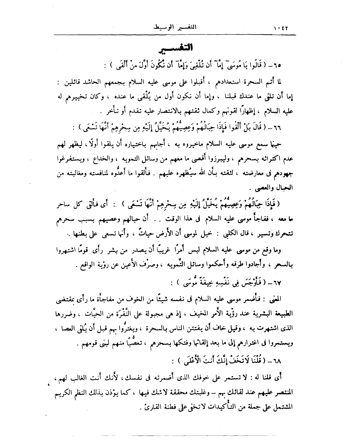 المعنى: فأضمر موسى عليه السلام في نفسه شيئًا من الخوف من مفاجأَة ما رأى بمقتضى الطبيعة البشرية عند رؤْية الأمر المخيف، إِذ هي مجبولة على النَّفْرَة من الحيَّات، وضررها الذي اشتهرت به، وقيل خاف أَن يفتتن الناس بالسحرة، ويغترُّوا بهم قبل أن يُلقى العصا، ويستمروا في اغترارهم إِلى ما بعد إِلقائها وفتكها بسحرهم، تعصُّبًا منهم لبنى قومهم.