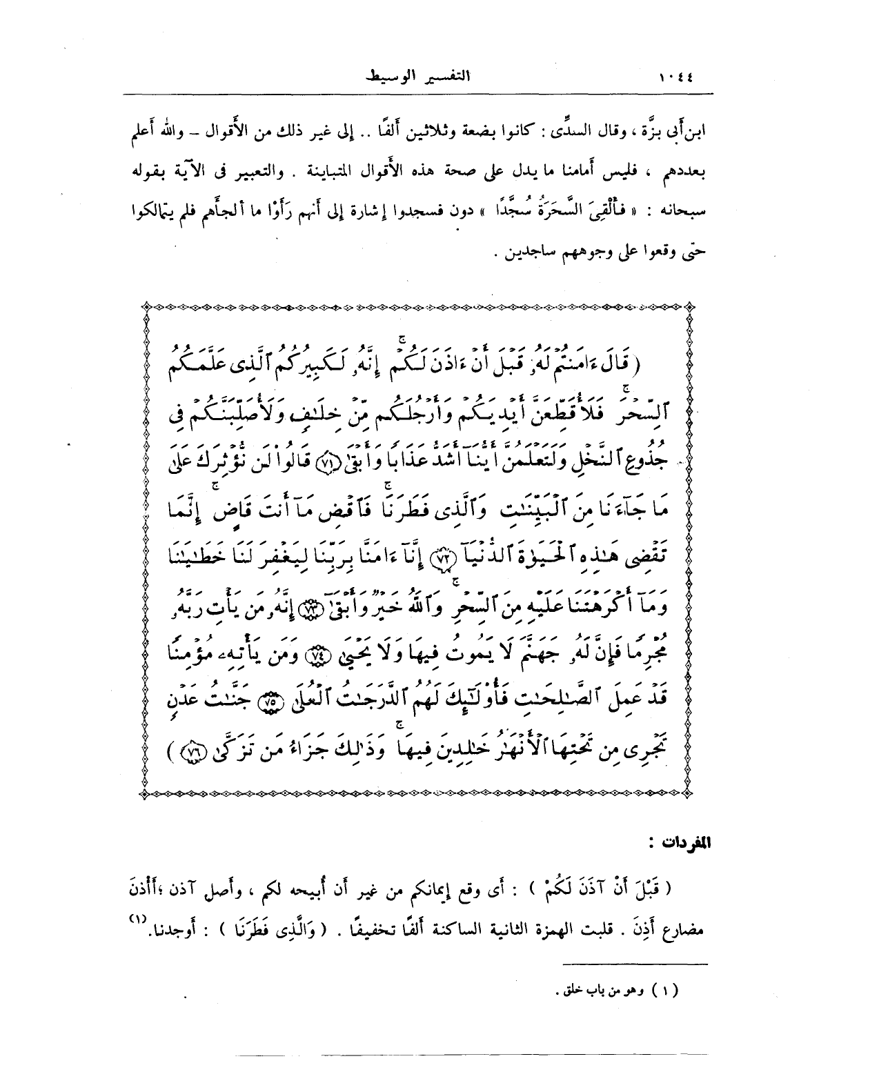 {قَبْلَ أَنْ آذَنَ لَكُمْ}: أَي وقع إيمانكم من غير أن أُبيحه لكم، وأَصل آذن؛ أَأْذنَ مضارع أَذِنَ. قلبت الهمزة الثانية الساكنة ألفًا تخفيفًا. {وَالَّذِي فَطَرَنَا}: أوجدنا (¬1).