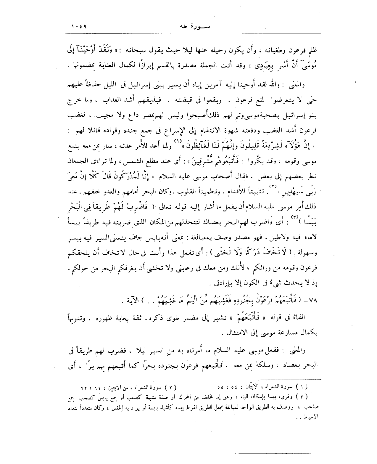 {إِنَّ هَؤُلَاءِ لَشِرْذِمَةٌ قَلِيلُونَ (54) وَإِنَّهُمْ لَنَا لَغَائِظُونَ} (1) ولما أَعد للأَمر عدته، سار بمن معه يتبع موسى وقومه، وقد بكروا {فَأَتْبَعُوهُمْ مُشْرِقِينَ}: أَي عند مطلع الشمس، ولما تراءَى الجمعان نظر بعضهم إلى بعض، فقال أَصحاب موسى عليه السلام {إِنَّا لَمُدْرَكُونَ (61) قَالَ كَلَّا إِنَّ مَعِيَ رَبِّي سَيَهْدِينِ} (¬2). تثبيتًا للأَقدام، وتطمينًا للقلوب، وكان البحر أَمامهم والعدو خلفهم. عند ذلك أُمِر موسى عليه السلام أَن يفعل ما أَشار إِليه قوله تعالى: {فَاضْرِبْ لَهُمْ طَرِيقًا فِي الْبَحْرِ يَبَسًا} (¬3): أَي فَاضرب لهم البحر بعصاك لتتخذ لهم من المكان الذي ضربته فيه طريقا يبسًا لا ماءَ فيه ولا طين. فهو مصدر وصف به مبالغة: بمعنى أَنه يابس جاف يتسنى السير فيه بيسر وسهولة. {لَا تَخَافُ دَرَكًا وَلَا تَخْشَى}: أَي تفعل هذا وأَنت في حال لا تخاف أَن يلحقكم فرعون وقومه من ورائكم، لأَنك ومن معك في رعايتى ولا تخشى أَن يغرقكم البحر من حولكم، إِذ لا يحدث شىءٌ في الكون إلا بإِرادتى.