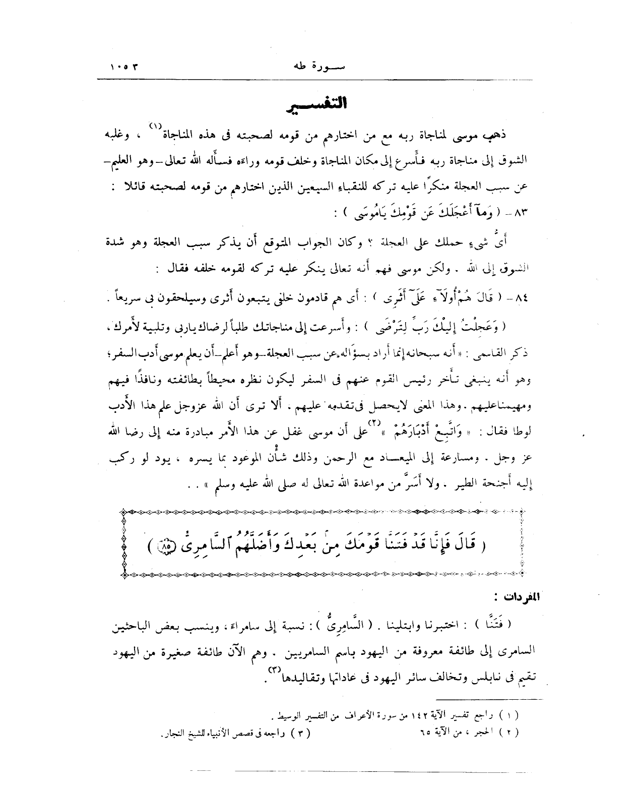 {فَتَنَّا}: اختبرنا وابتلينا. {السَّامِرِيُّ}: نسبة إِلى سامراءَ، وينسب بعض الباحثين السامرى إِلى طائفة معروفة من اليهود باسم السامريين، وهم الآن طائفة صغيرة من اليهود تقيم في نابلس وتخالف سائر اليهود في عاداتها وتقاليدها (¬3).