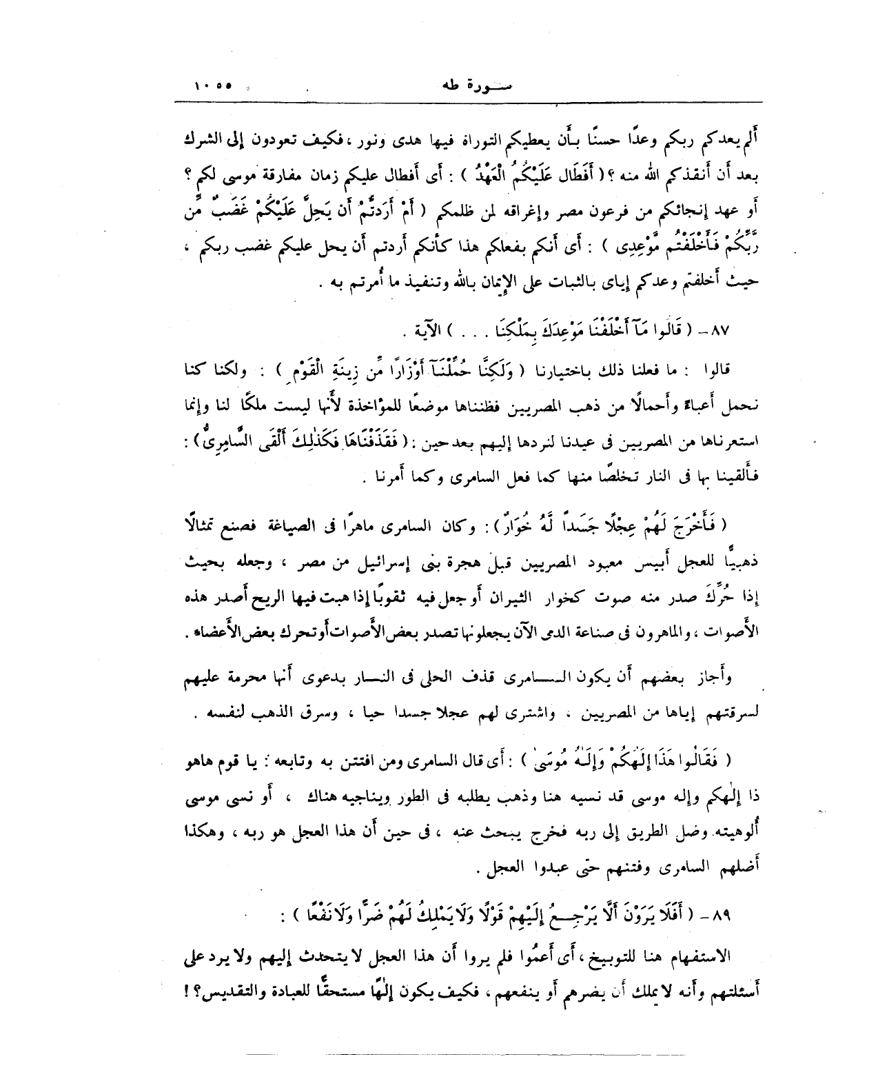ألم يعدكم ربكم وعدًا حسنًا بأن يعطيكم التوراة فيها هدى ونور، فكيف تعودون إلى الشرك بعد أن أَنقذكم الله منه؟ {أَفَطَالَ عَلَيْكُمُ الْعَهْدُ}: أي أَفطال عليكم زمان مفارقة موسى لكم؟ أَو عهد إِنجائكم من فرعون مصر وإغراقه لمن ظلمكم {أَمْ أَرَدْتُمْ أَنْ يَحِلَّ عَلَيْكُمْ غَضَبٌ مِنْ رَبِّكُمْ فَأَخْلَفْتُمْ مَوْعِدِي}: أَي أَنكم بفعلكم هذا كأنكم أردتم أن يحل عليكم غضب ربكم، حيث أَخلفتم وعدكم إِياى بالثبات على الإِيمان بالله وتنفيذ ما أُمرتم به.