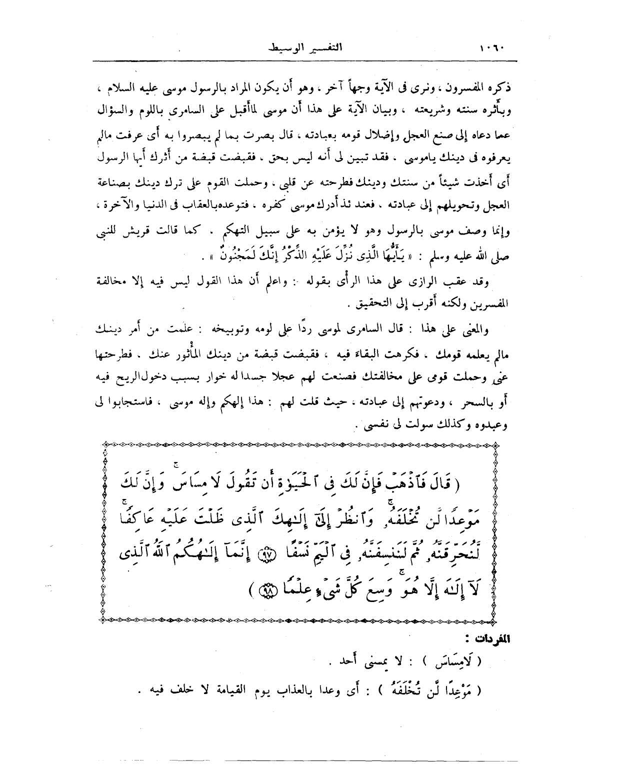 ذكره المفسرون، ونرى في الآية وجهًا آخر، وهو إن يكون المراد بالرسول موسى عليه السلام، وبأثره سنته وشريعته، وبيان الآية على هذا أَن موسى لما أقبل على السامري باللوم والسؤال عما دعاه إِلى صنع العجل وإِضلال قومه بعبادته، قال بصرت بما لم يبصروا به أي عرفت ما لم يعرفوه في دينك يا موسى، فقد تبين لي أَنه ليس بحق، فقبضت قبضة من أَثرك أَيها الرسول أَي أخذت شيئًا من سنتك ودينك فطرحته عن قلبى، وحملت القوم على ترك دينك بصناعة العجل وتحويلهم إلى عبادته، فعندئذ أَدرك موسى كفره، فتوعده بالعقاب في الدنيا والآخرة، وإنما وصف موسى بالرسول وهو لا يؤمن به على سبيل التهكم، كما قالت قريش للنبي - صلى الله عليه وسلم -: {يَا أَيُّهَا الَّذِي نُزِّلَ عَلَيْهِ الذِّكْرُ إِنَّكَ لَمَجْنُونٌ}.
