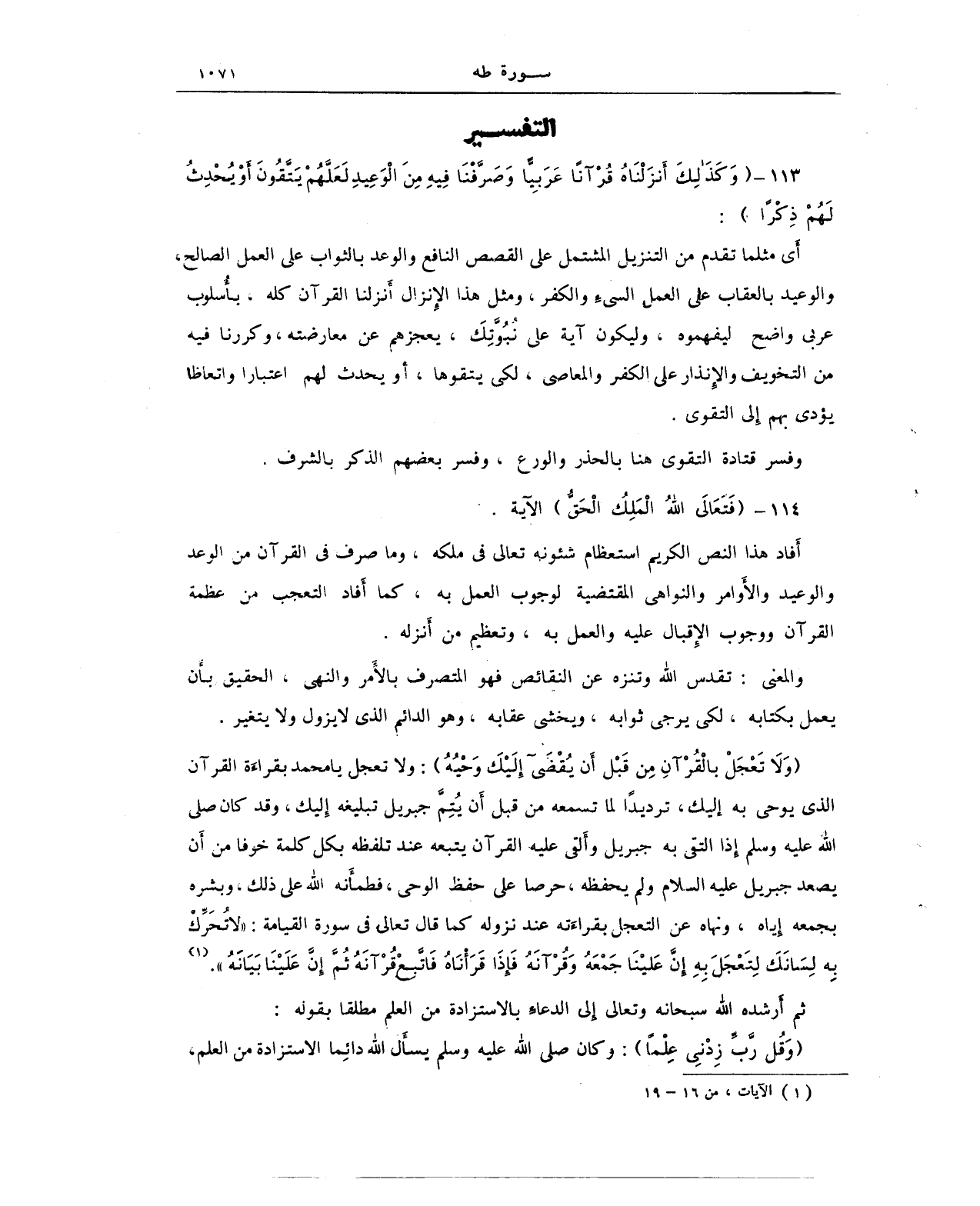 {وَلَا تَعْجَلْ بِالْقُرْآنِ مِنْ قَبْلِ أَنْ يُقْضَى إِلَيْكَ وَحْيُهُ}: ولا تعجل يا محمد بقراءَة القرآن الذي يوحى به إليك، ترديدًا لما تسمعه من قبل أَن يُتِمَّ جبريل تبليغه إِليك، وقد كان - صلى الله عليه وسلم - إذا التقى به جبريل وأَلقى عليه القرآن يتبعه عند تلفظه بكل كلمة خوفا من أَن يصعد جبريل عليه السلام ولم يحفظه، حرصا على حفظ الوحى، فطمأَنه الله على ذلك، وبشره بجمعه إياه، ونهاه عن التعجل بقراءَته عند نزوله كما قال تعالى في سورة القيامة: {لَا تُحَرِّكْ بِهِ لِسَانَكَ لِتَعْجَلَ بِهِ (16) إِنَّ عَلَيْنَا جَمْعَهُ وَقُرْآنَهُ (17) فَإِذَا قَرَأْنَاهُ فَاتَّبِعْ قُرْآنَهُ (18) ثُمَّ إِنَّ عَلَيْنَا بَيَانَهُ} (¬1).