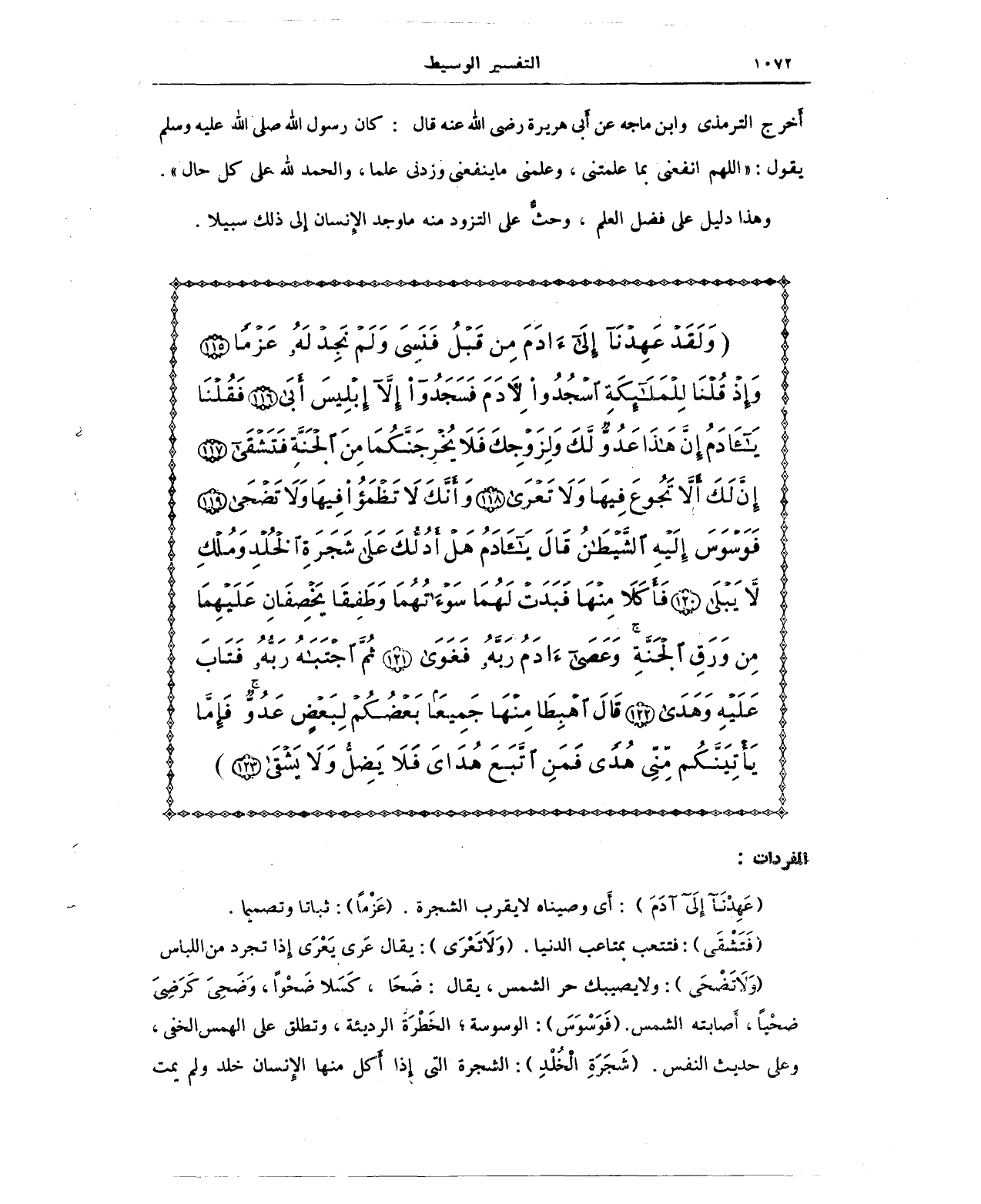 {وَلَا تَضْحَى}: ولا يصيبك حر الشمس، يقال: ضَحَا، كَسَلا ضَحْوًا، وَضَحِىَ كَرَضِىَ ضحْيًا، أَصابته الشمس. {فَوَسْوَسَ}: الوسوسة؛ الخَطْرَةَ الرديئة، وتطلق على الهمس الخفى، وعلى حديث النفس. {شَجَرَةِ الْخُلْدِ}: الشجرة التي إِذا أَكل منها الإِنسان خلد ولم يمت