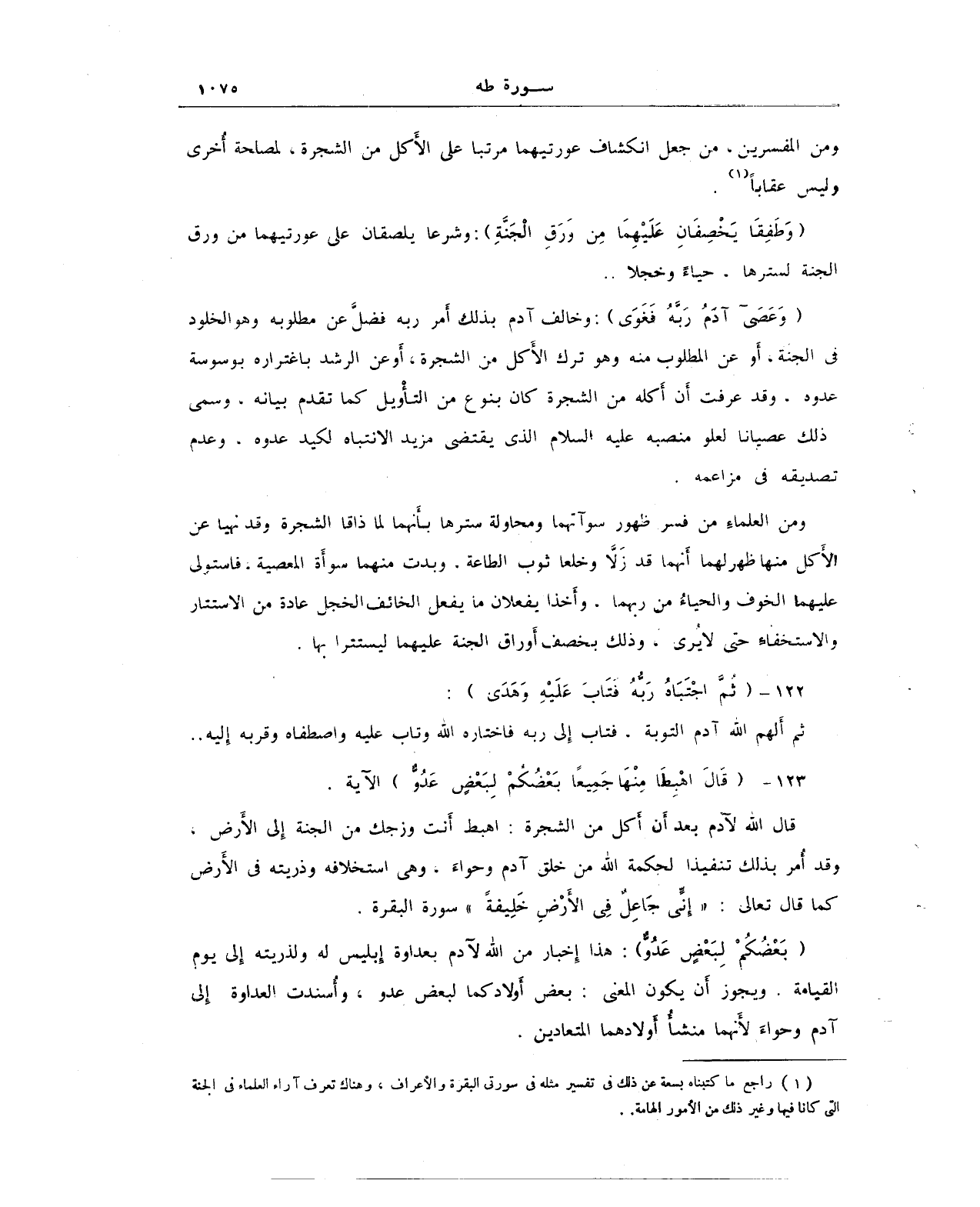 (¬1) راجع ما كتبناه بسعة عن ذلك في تفسير مثله في سورتى البقرة والأعراف، وهناك تعرف آراء العلماء في الجنة التي كانا فيها وغير ذلك من الأمور الهامة.