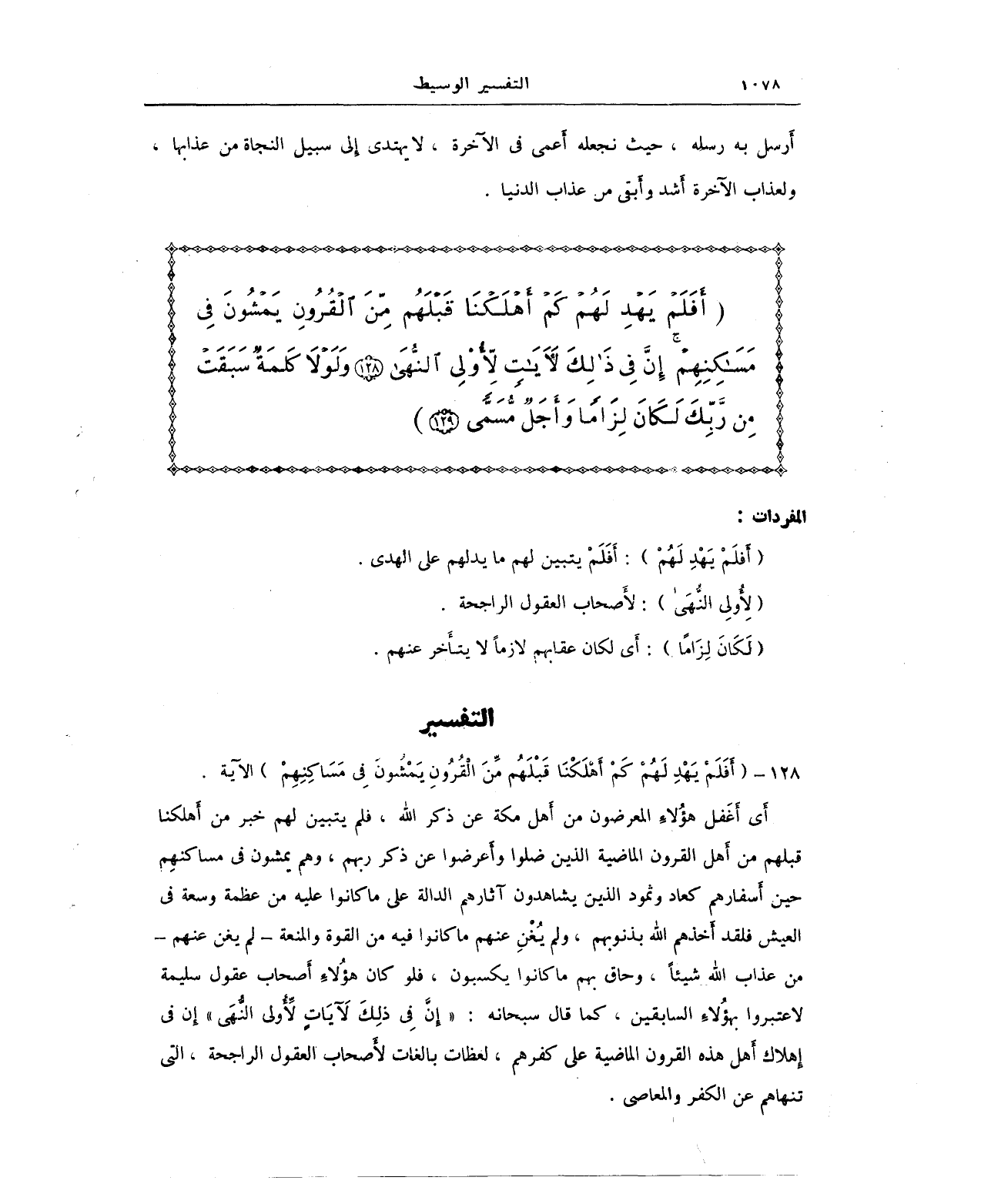 128 - {أَفَلَمْ يَهْدِ لَهُمْ كَمْ أَهْلَكْنَا قَبْلَهُمْ مِنَ الْقُرُونِ يَمْشُونَ فِي مَسَاكِنِهِمْ ... } الآية.