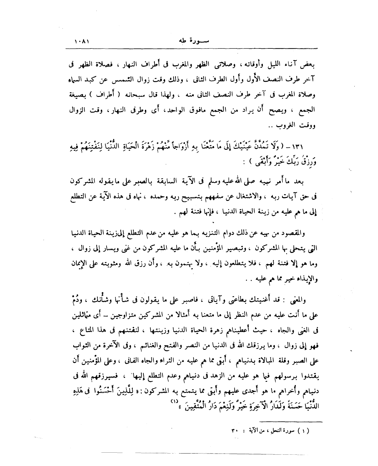 والمعنى: قد أغنيتك بطاعتى وآياتى، فاصبر على ما يقولون في شأْنها وشأنك، ودُمْ على ما أنت عليه من عدم النظر إِلى ما متعنا به أَمثالا من المشركين متزاوجين - أَي متماثلين في الغنى والجاه، حيث أَعطيناهم زهرة الحياة الدنيا وزينتها، لنفتنهم في هذا المتاع، فهو إلى زوال، وما يرزقك الله في الدنيا من النصر والفتح والغنائم، وفي الآخرة من الثواب على الصبر وقلة المبالاة بدنياهم، أَبقى مما هم عليه من الثراء والجاه الفانى، وعلى المؤْمنين أن يقتدوا برسولهم فيما هو عليه من الزهد في دنياهم وعدم التطلع إِليها، فسيرزقهم الله في دنياهم وأُخراهم ما هو أَجدى عليهم وأَبقى مما يتمتع به المشركون: {لِلَّذِينَ أَحْسَنُوا فِي هَذِهِ الدُّنْيَا حَسَنَةٌ وَلَدَارُ الْآخِرَةِ خَيْرٌ وَلَنِعْمَ دَارُ الْمُتَّقِينَ} (¬1).