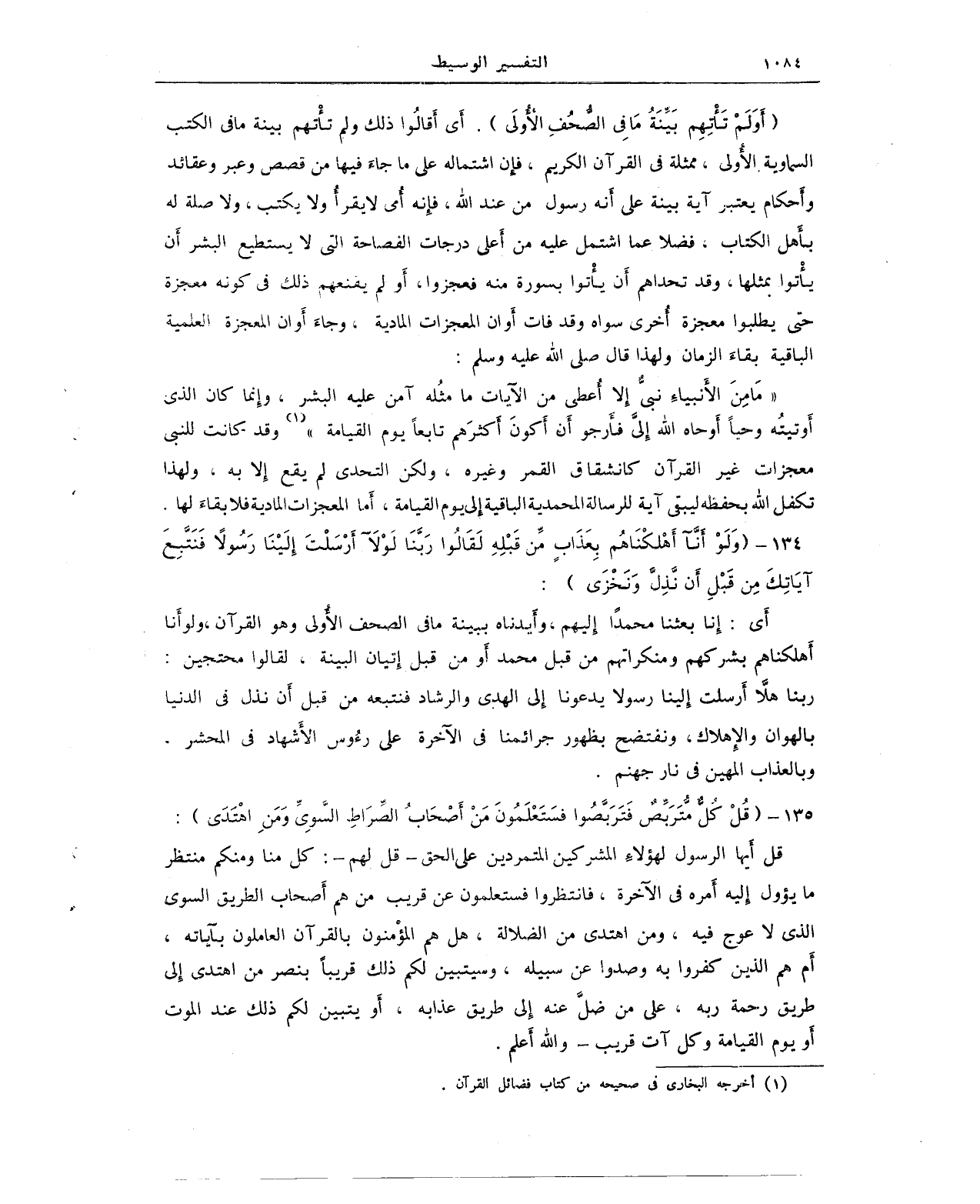 {أَوَلَمْ تَأْتِهِمْ بَيِّنَةُ مَا فِي الصُّحُفِ الْأُولَى}. أَي أَقالُوا ذلك ولم تأْتهم بينة ما في الكتب السماوية الأُولى، ممثلة في القرآن الكريم، فإن اشتماله على ما جاءَ فيها من قصص وعبر وعقائد وأَحكام يعتبر آية بينة على أَنه رسول من عند الله، فإِنه أُمى لا يقرأُ ولا يكتب، ولا صلة له بأَهل الكتاب، فضلا عما اشتمل عليه من أَعلى درجات الفصاحة التي لا يستطيع البشر أَن يأْتوا بمثلها، وقد تحداهم أَن يأْتوا بسورة منه فعجزوا، أَولم يقنعهم ذلك في كونه معجزة حتى يطلبوا معجزة أُخرى سواه وقد فات أَوان المعجزات المادية، وجاءَ أَوان المعجزة العلمية الباقية بقاءَ الزمان ولهذا قال - صلى الله عليه وسلم -: