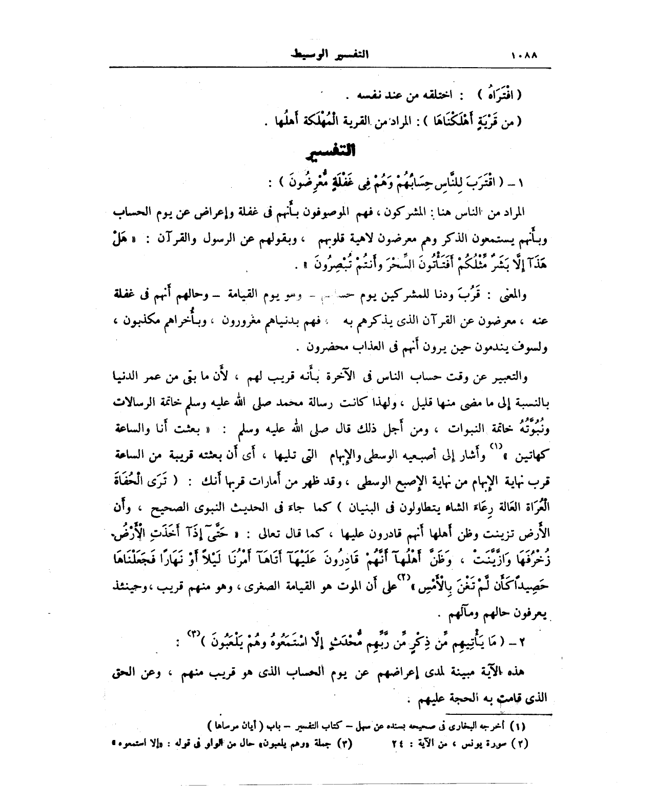 والتعبير عن وقت حساب الناس في الآخرة بأَنه قريب لهم، لأن ما بقى من عمر الدنيا بالنسبة إِلى ما مضى منها قليل، ولهذا كانت رسالة محمد - صلى الله عليه وسلم - خاتمة الرسالات ونُبُوَّتُهُ خاتمة النبوات، ومن أجل ذلك قال - صلى الله عليه وسلم -: "بعثت أنا والساعة كهاتين" (¬1) وأشار إِلى أصبعيه الوسطى والإبهام التي تليها، أي أَن بعثته قريبة من الساعة قرب نهاية الإبهام من نهاية الإصبع الوسطى، وقد ظهر من أَمارات قربها أَنك: (تَرَى الْحُفَاةَ العُرَاة العَالة رِعَاء الشاء يتطاولون في البنيان) كما جاء في الحديث النبوى الصحيح، وأن الأرض تزينت وظن أهلها أَنهم قادرون عليها، كما قال تعالى: {حَتَّى إِذَا أَخَذَتِ الْأَرْضُ زُخْرُفَهَا وَازَّيَّنَتْ وَظَنَّ أَهْلُهَا أَنَّهُمْ قَادِرُونَ عَلَيْهَا أَتَاهَا أَمْرُنَا لَيْلًا أَوْ نَهَارًا فَجَعَلْنَاهَا حَصِيدًا كَأَنْ لَمْ تَغْنَ بِالْأَمْسِ} (¬2) على أن الموت هو القيامة الصغرى، وهو منهم قريب، وحينئذ يعرفون حالهم ومآلهم.