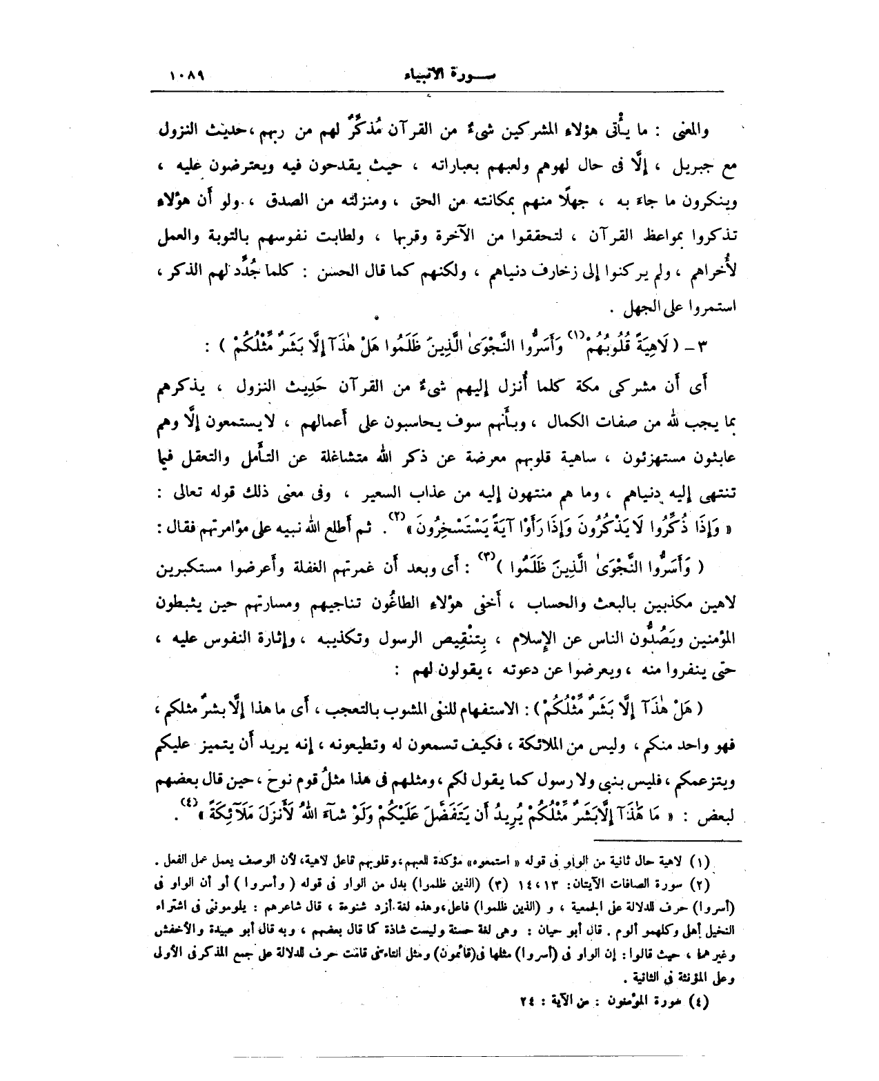 3 - {لَاهِيَةً قُلُوبُهُمْ (¬1) وَأَسَرُّوا النَّجْوَى الَّذِينَ ظَلَمُوا هَلْ هَذَا إِلَّا بَشَرٌ مِثْلُكُمْ}: