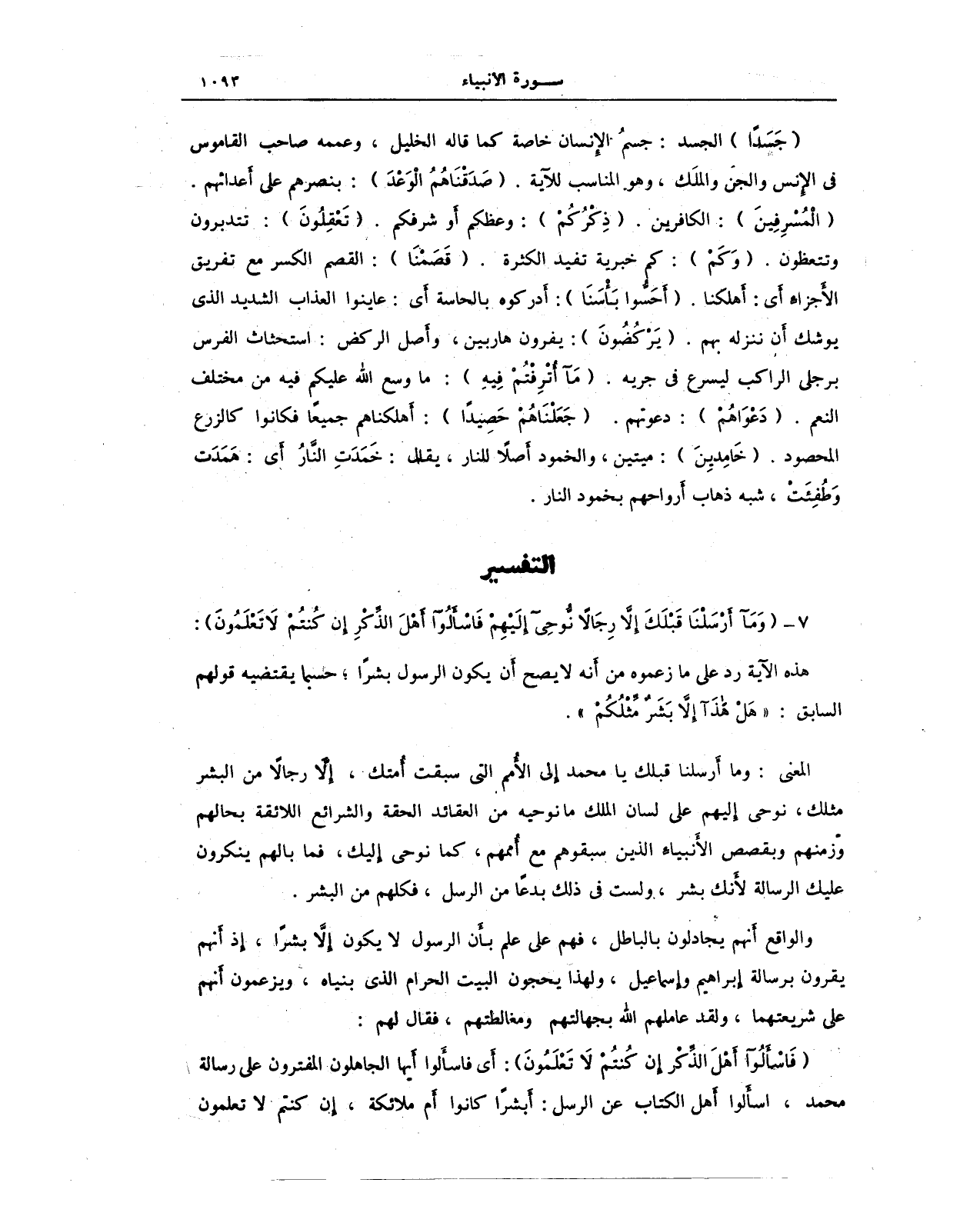 المعنى: وما أرسلنا قبلك يا محمد إِلى الأُمم التي سبقت أُمتك، إِلا رجالًا من البشر مثلك، نوحى إِليهم على لسان الملك ما نوحيه من العقائد الحقة والشرائع اللائقة بحالهم وزمنهم وبقصص الأَنبياء الذين سبقوهم مع أُممهم، كما نوحى إِليك، فما بالهم ينكرون عليك الرسالة لأنك بشر، ولست في ذلك بدعًا من الرسل، فكلهم من البشر.