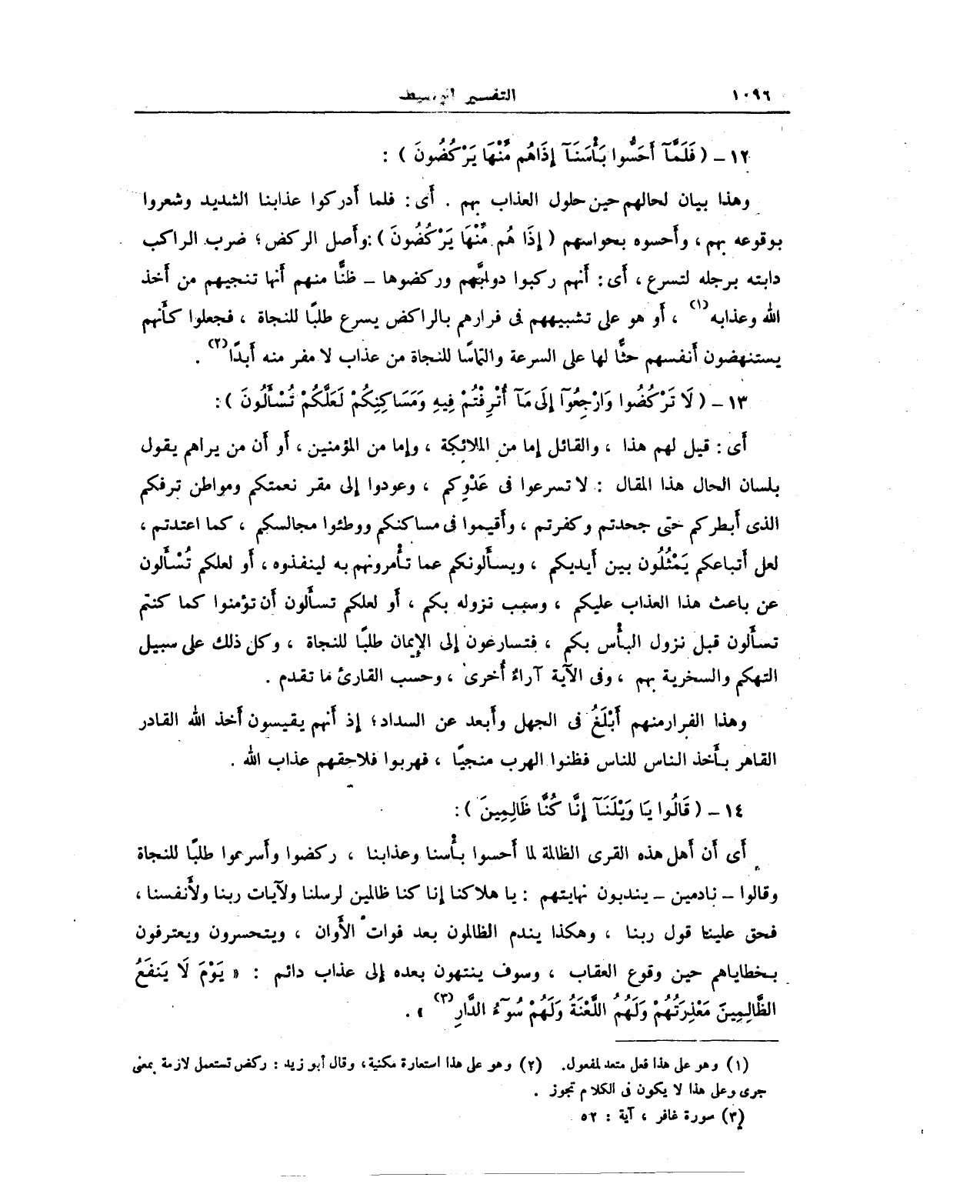 أي أن أهل هذه القرى الظالمة لما أَحسوا بأْسنا وعذابنا، ركضوا وأسرعوا طلبًا للنجاة وقالوا - نادمين - يندبون نهايتهم: يا هلاكنا إنا كنا ظالمين لرسلنا ولآيات ربنا ولأنفسنا، فحق علينا قول ربنا، وهكذا يندم الظالمون بعد فوات الأوان، ويتحسرون ويعترفون بخطاياهم حين وقوع العقاب، وسوف ينتهون بعده إلى عذاب دائم: {يَوْمَ لَا يَنْفَعُ الظَّالِمِينَ مَعْذِرَتُهُمْ وَلَهُمُ اللَّعْنَةُ وَلَهُمْ سُوءُ الدَّار} (¬3).