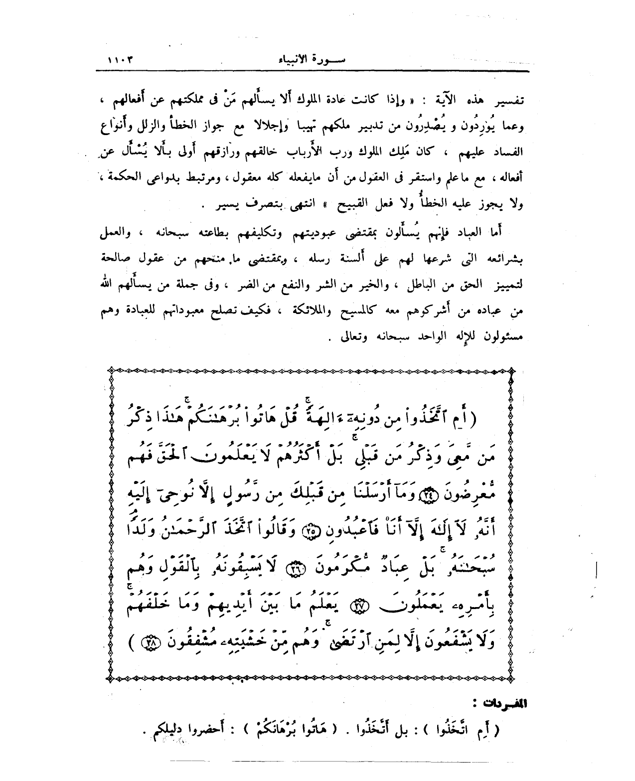 {أَمِ اتَّخَذُوا مِنْ دُونِهِ آلِهَةً قُلْ هَاتُوا بُرْهَانَكُمْ هَذَا ذِكْرُ مَنْ مَعِيَ وَذِكْرُ مَنْ قَبْلِي بَلْ أَكْثَرُهُمْ لَا يَعْلَمُونَ الْحَقَّ فَهُمْ مُعْرِضُونَ (24) وَمَا أَرْسَلْنَا مِنْ قَبْلِكَ مِنْ رَسُولٍ إِلَّا نُوحِي إِلَيْهِ أَنَّهُ لَا إِلَهَ إِلَّا أَنَا فَاعْبُدُونِ (25) وَقَالُوا اتَّخَذَ الرَّحْمَنُ وَلَدًا سُبْحَانَهُ بَلْ عِبَادٌ مُكْرَمُونَ (26) لَا يَسْبِقُونَهُ بِالْقَوْلِ وَهُمْ بِأَمْرِهِ يَعْمَلُونَ (27) يَعْلَمُ مَا بَيْنَ أَيْدِيهِمْ وَمَا خَلْفَهُمْ وَلَا يَشْفَعُونَ إِلَّا لِمَنِ ارْتَضَى وَهُمْ مِنْ خَشْيَتِهِ مُشْفِقُونَ} المفردات: