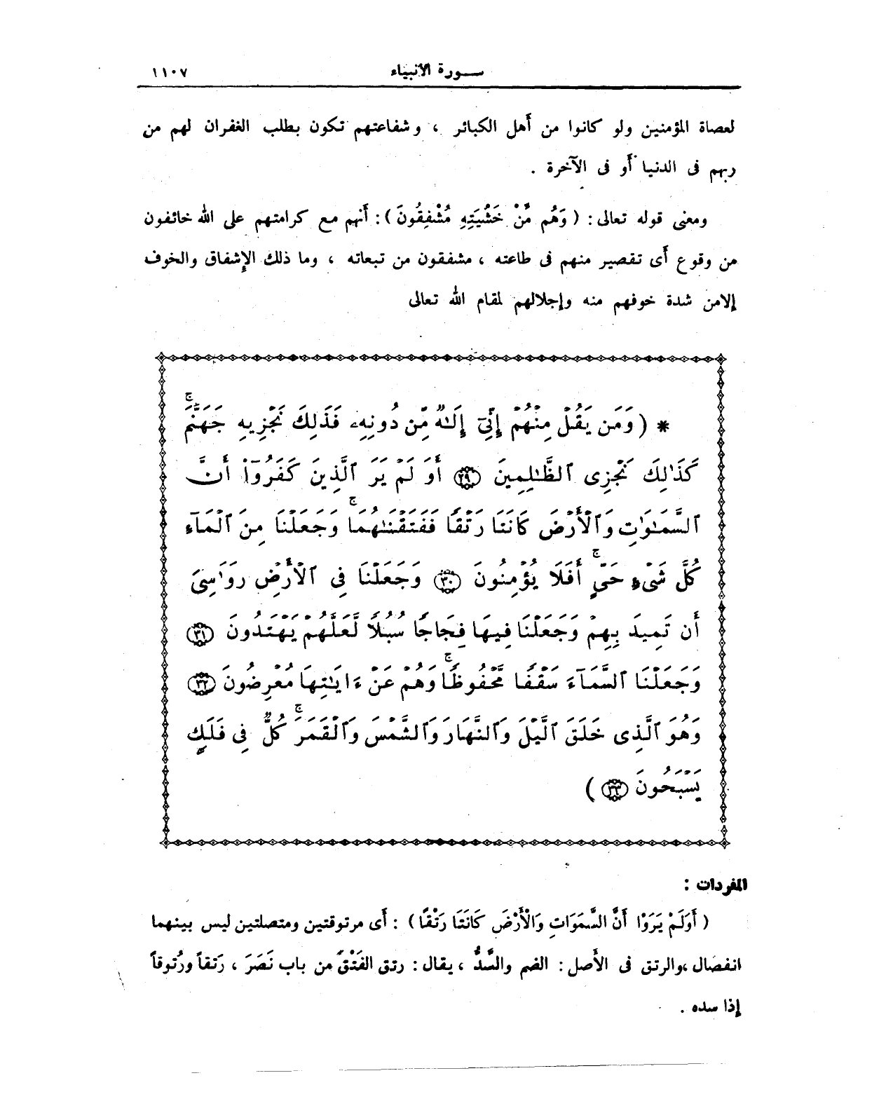 {أَوَلَمْ يَرَ الَّذِينَ كَفَرُوا أَنَّ السَّمَاوَاتِ وَالْأَرْضَ كَانَتَا رَتْقًا}: أَي مرتوقتين ومتصلتين ليس بينهما انفضال، والرتق في الأصل: الضم والسَّدُّ، يقال: رتق الفتق من باب نَصَرَ، رَتقًا ورُتوقًا إذا سده.
