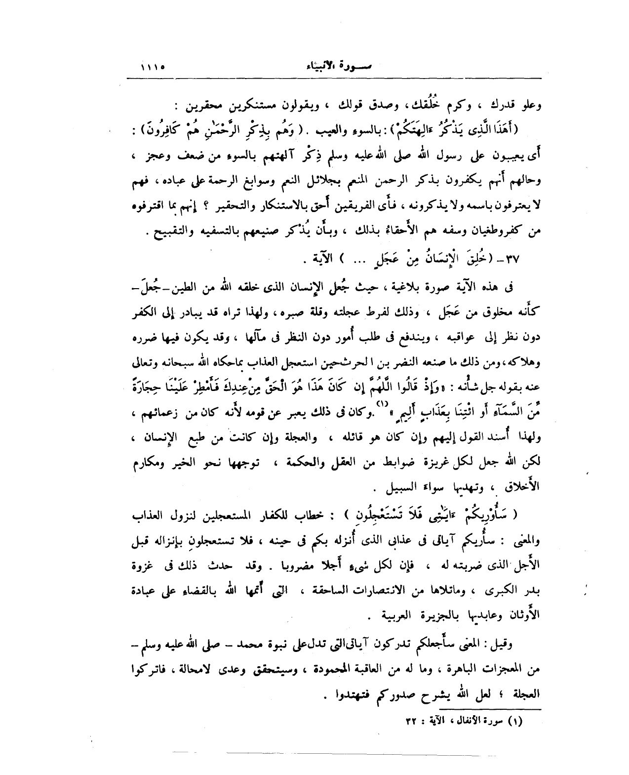 في هذه الآية صورة بلاغية، حيث جُعل الإنسان الذي خلقه الله من الطين - جُعلَ - كأَنه مخلوق من عَجَل، وذلك لفرطِ عجلته وقلة صبره، ولهذا تراه قد يبادر إِلى الكفر دون نظر إلى عواقبه، ويندفع في طلب أُمور دون النظر في مآلها، وقد يكون فيها ضرره وهلاكه، ومن ذلك ما صنعه النضر بن الحرث حين استعجل العذاب بما حكاه الله سبحانه وتعالى عنه بقوله جل شأْنه: {قَالُوا اللَّهُمَّ إِنْ كَانَ هَذَا هُوَ الْحَقَّ مِنْ عِنْدِكَ فَأَمْطِرْ عَلَيْنَا حِجَارَةً مِنَ السَّمَاءِ أَوِ ائْتِنَا بِعَذَابٍ أَلِيمٍ} (¬1). وكان في ذلك يعبر عن قومه لأنه كان من زعمائهم، ولهذا أُسند القول إليهم وإن كان هو قائله، والعجلة وإِن كانت من طبع الإِنسان، لكن الله جعل لكل غريزة ضوابط من العقل والحكمة، توجهها نحو الخير ومكارم الأخلاق، وتهديها سواءَ السبيل.