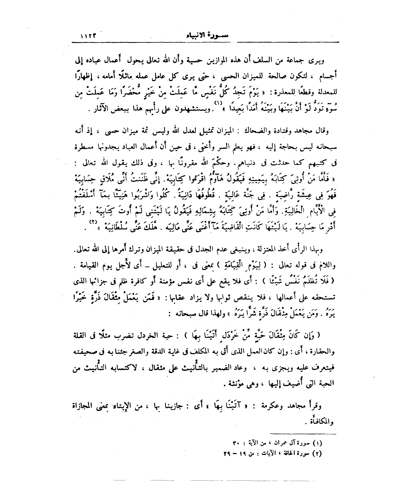 وبهذا الرأى أَخذ المعتزلة، وينبغى عدم الجدل في حقيقة الميزان وترك أَمرها إِلى الله تعالى. واللام في قوله تعالى: {لِيَوْمِ الْقِيَامَةِ} بمعنى في، أَو للتعليل - أَي لأجل يوم القيامة.