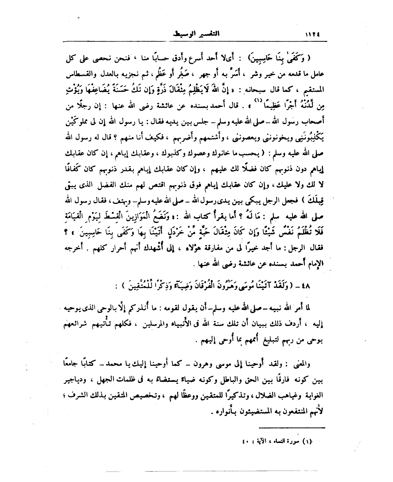 {وَكَفَى بِنَا حَاسِبِينَ}: أي لا أحد أَسرع وأدق حسابًا منا، فنحن نحصى على كل عامل ما قدمه من خير وشر، أَسَرَّ به أَو جهر، صَغُر أَو عَظُم، ثم نجزيه بالعدل والقسطاس المستقيم، كما قال سبحانه: {إِنَّ اللَّهَ لَا يَظْلِمُ مِثْقَالَ ذَرَّةٍ وَإِنْ تَكُ حَسَنَةً يُضَاعِفْهَا وَيُؤْتِ مِنْ لَدُنْهُ أَجْرًا عَظِيمًا} (¬1). قال أحمد بسنده عن عائشة رضى الله عنها: "إن رجلًا من أَصحاب رسول الله - صلى الله عليه وسلم - جلس بين يديه فقال: يا رسول الله إِن لى مملوكَيْن يَكْذِبُونَنِى ويخونوننى ويعصوننى، وأَشتمهم وأَضربهم، فكيف أنا منهم؟ قال له رسول الله - صلى الله عليه وسلم -: (بحسب ما خانوك وعصوك وكذبوك، وعقابك إياهم، إن كان عقابك إياهم دون ذنوبهم كان فضلًا لك عليهم، وإن كان عقابك إياهم بقدر ذنوبهم كان كَفافًا لا لك ولا عليك، وإن كان عقابك إياهم فوق ذنوبهم أقتص لهم منك الفضل الذي يبقى قِبلَك) فجعل الرجل يبكى بين يدى رسول الله - صلى الله عليه وسلم - ويهتف، فقال رسول الله - صلى الله عليه وسلم -: مَا لَهُ؟ أَما يقرأْ كتاب الله: {وَنَضَعُ الْمَوَازِينَ الْقِسْطَ لِيَوْمِ الْقِيَامَةِ فَلَا تُظْلَمُ نَفْسٌ شَيْئًا وَإِنْ كَانَ مِثْقَالَ حَبَّةٍ مِنْ خَرْدَلٍ أَتَيْنَا بِهَا وَكَفَى بِنَا حَاسِبِينَ}؟ فقال الرجل: ما أَجد خيرًا لى من مفارقة هؤلاءِ، إني أُشْهدك أنهم أحرار كلهم. أَخرجه الإمام أَحمد بسنده عن عائشة رضى الله عنها.