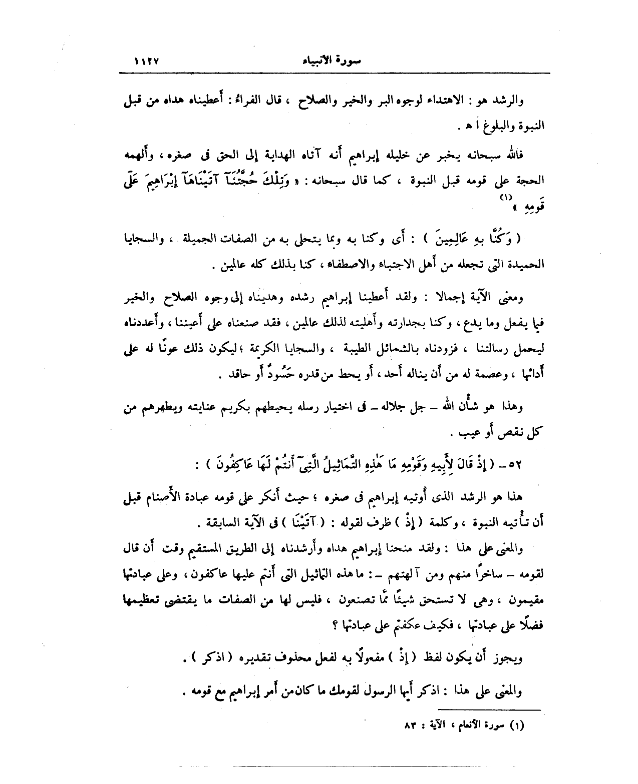 هذا هو الرشد الذي أوتيه إِبراهيم في صغره، حيث أَنكر على قومه عبادة الأَصنام قبل أن تأْتيه النبوة، وكلمة (إِذْ) ظرف لقوله: (آتَيْنَا) في الآية السابقة.