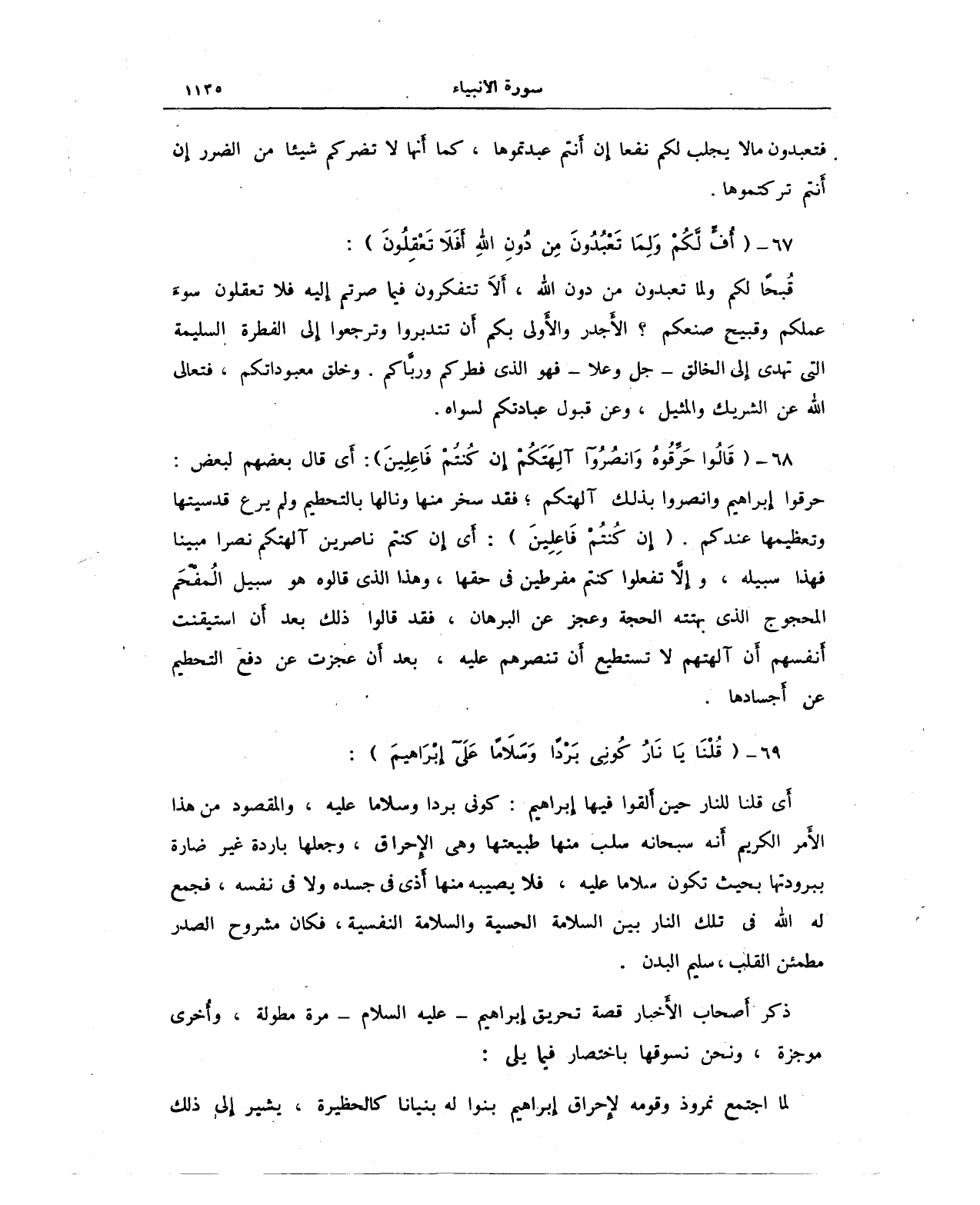 68 - {قَالُوا حَرِّقُوهُ وَانْصُرُوا آلِهَتَكُمْ إِنْ كُنْتُمْ فَاعِلِينَ}: أَي قال بعضهم لبعض: حرقوا إِبراهيم وانصروا بذلك آلهتكم، فقد سخر منها ونالها بالتحطيم ولم يرع قدسيتها وتعظيمها عندكم. {إِنْ كُنْتُمْ فَاعِلِينَ}: أَي إِن كنتم ناصرين آلهتكم نصرا مبينا فهذا سبيله، وإِلَّا تفعلوا كنتم مفرطين في حقها، وهذا الذي قالوه هو سبيل المُفْحَم المحجوج الذي بهتته الحجة وعجز عن البرهان، فقد قالوا ذلك بعد أَن استيقنت أَنفسهم أَن آلهتهم لا تستطيع أن تنصرهم عليه، بعد أَن عجزت عن دفع التحطيم عن أجسادها.