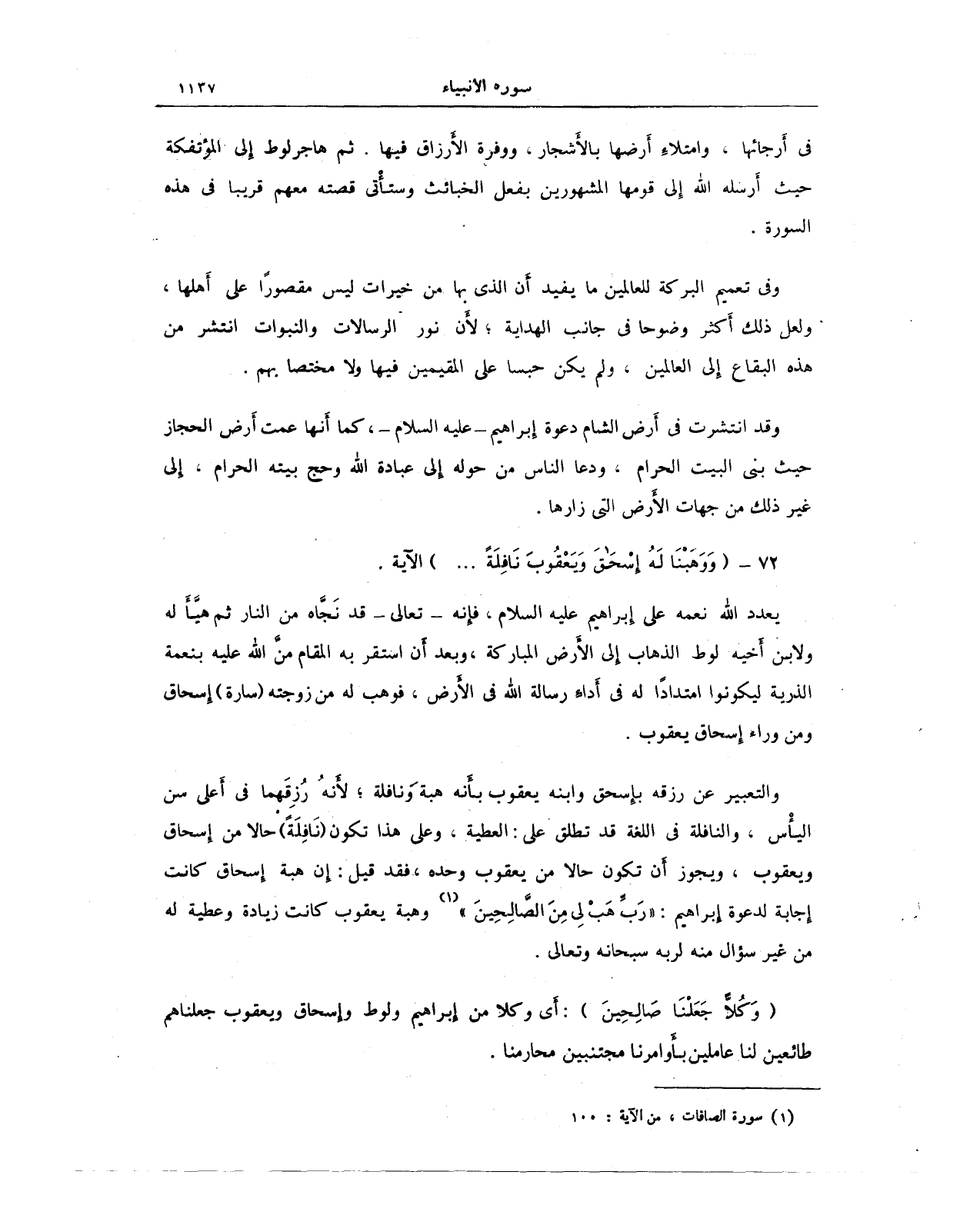 يعدد الله نعمه على إبراهيم عليه السلام، فإِنه - تعالى - قد نَجَّاه من النار ثم هيَّأَ له ولابن أَخيه لوط الذهاب إِلى الأَرض المباركة، وبعد أن استقر به المقام منَّ الله عليه بنعمة الذرية ليكونوا امتدادًا له في أَداءِ رسالة الله في الأرض، فوهب له من زوجته (سارة) إِسحاق ومن وراء إِسحاق يعقوب.