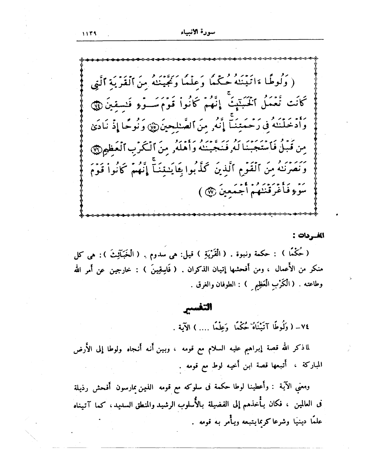74 - {وَلُوطًا آتَيْنَاهُ حُكْمًا وَعِلْمًا ..... } الآية.