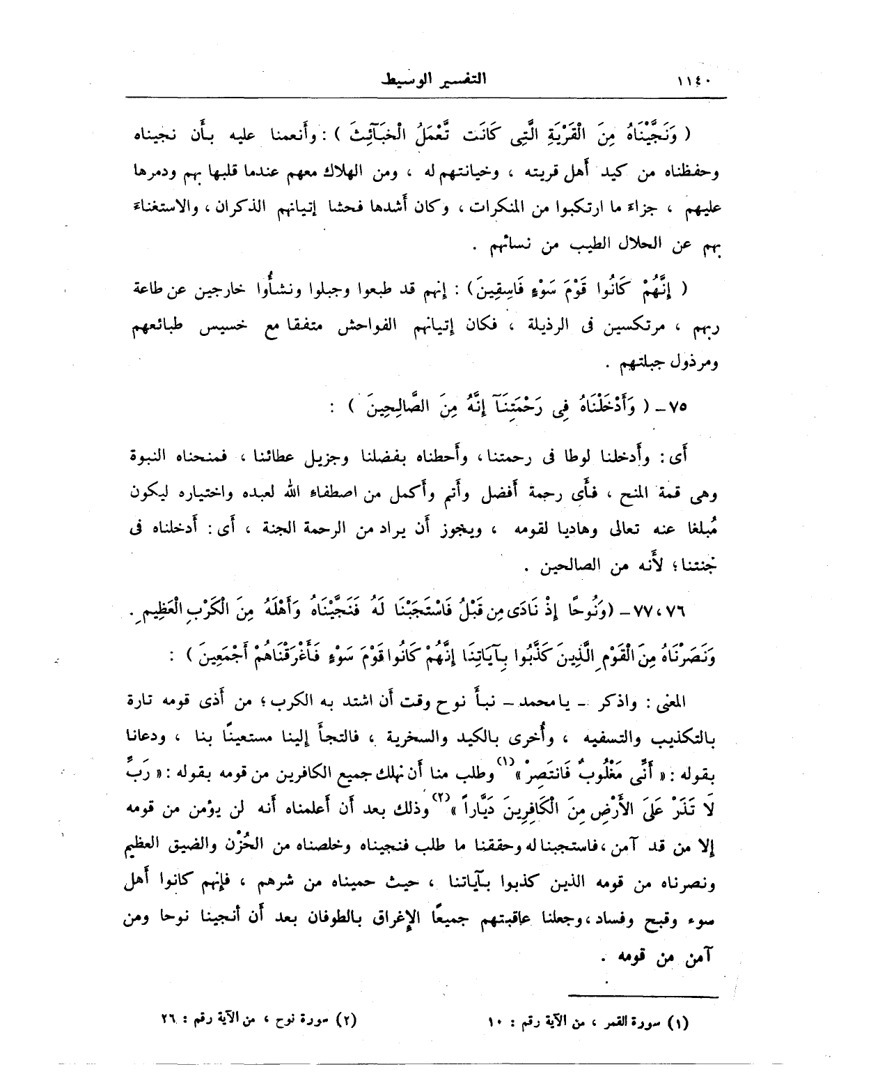 {وَنَجَّيْنَاهُ مِنَ الْقَرْيَةِ الَّتِي كَانَتْ تَعْمَلُ الْخَبَائِثَ}: وأَنعمنا عليه بأن نجيناه وحفظناه من كيد أَهل قريته، وخيانتهم له، ومن الهلاك معهم عندما قلبها بهم ودمرها عليهم، جزاءَ ما ارتكبوا من المنكرات، وكان أَشدها فحشا إتيانهم الذكران، والاستغناءَ بهم عن الحلال الطيب من نسائهم.