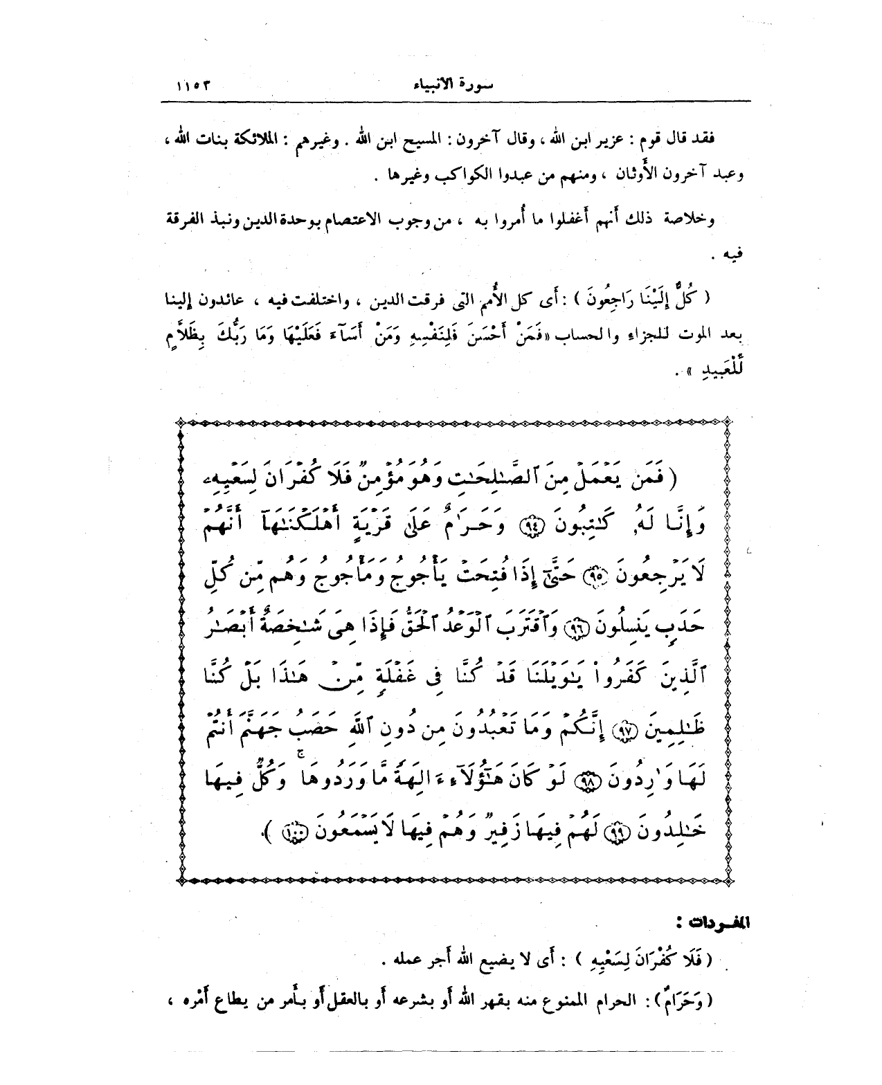 {فَمَنْ يَعْمَلْ مِنَ الصَّالِحَاتِ وَهُوَ مُؤْمِنٌ فَلَا كُفْرَانَ لِسَعْيِهِ وَإِنَّا لَهُ كَاتِبُونَ (94) وَحَرَامٌ عَلَى قَرْيَةٍ أَهْلَكْنَاهَا أَنَّهُمْ لَا يَرْجِعُونَ (95) حَتَّى إِذَا فُتِحَتْ يَأْجُوجُ وَمَأْجُوجُ وَهُمْ مِنْ كُلِّ حَدَبٍ يَنْسِلُونَ (96) وَاقْتَرَبَ الْوَعْدُ الْحَقُّ فَإِذَا هِيَ شَاخِصَةٌ أَبْصَارُ الَّذِينَ كَفَرُوا يَا وَيْلَنَا قَدْ كُنَّا فِي غَفْلَةٍ مِنْ هَذَا بَلْ كُنَّا ظَالِمِينَ (97) إِنَّكُمْ وَمَا تَعْبُدُونَ مِنْ دُونِ اللَّهِ حَصَبُ جَهَنَّمَ أَنْتُمْ لَهَا وَارِدُونَ (98) لَوْ كَانَ هَؤُلَاءِ آلِهَةً مَا وَرَدُوهَا وَكُلٌّ فِيهَا خَالِدُونَ (99) لَهُمْ فِيهَا زَفِيرٌ وَهُمْ فِيهَا لَا يَسْمَعُونَ (100)}