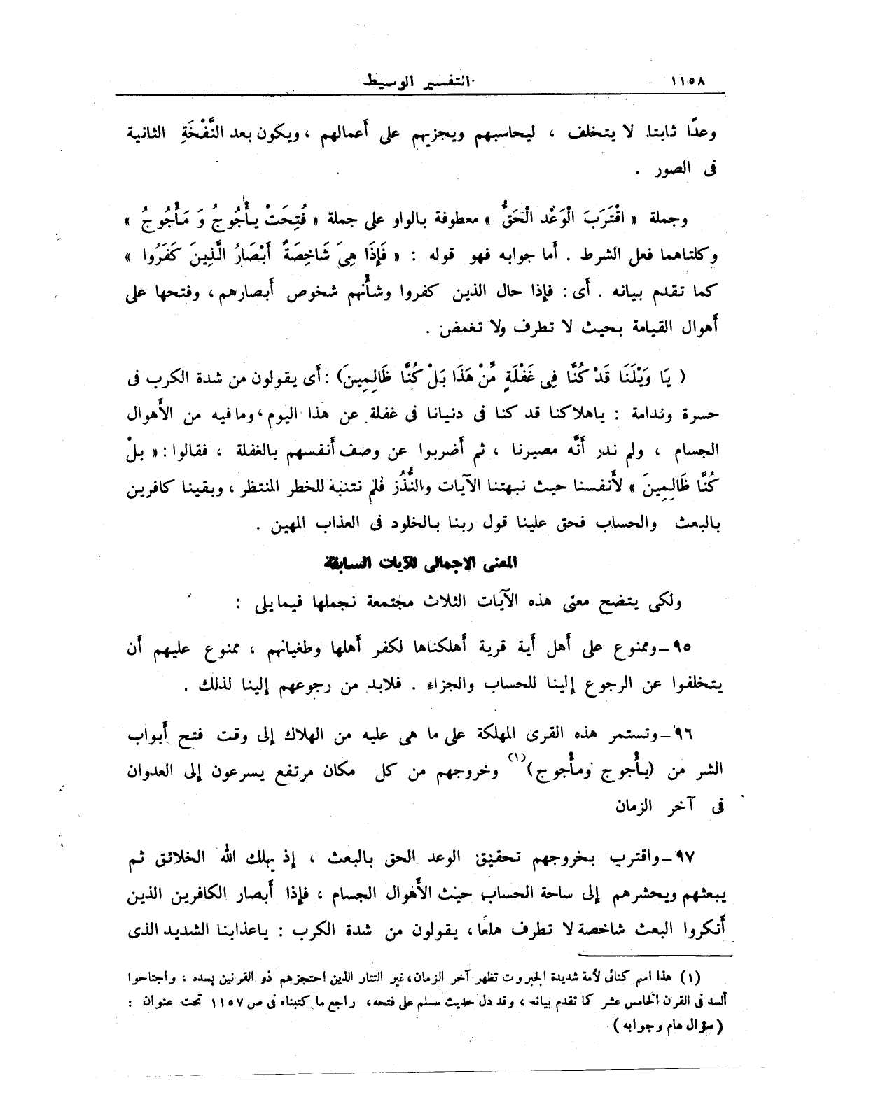 (¬1) هذا اسم كنائى لأمة شديدة الجبروت تظهر آخر الزمان، غير التتار الذين احتجزهم ذو القرنين بسده، واجتاحوا السد في القرن الخامس عشر كما تقدم بيانه، وقد دل حديث مسلم على فتحه، راجع ما كتبناه في ص 1157 تحت عنوان: (سؤال هام وجوابه).