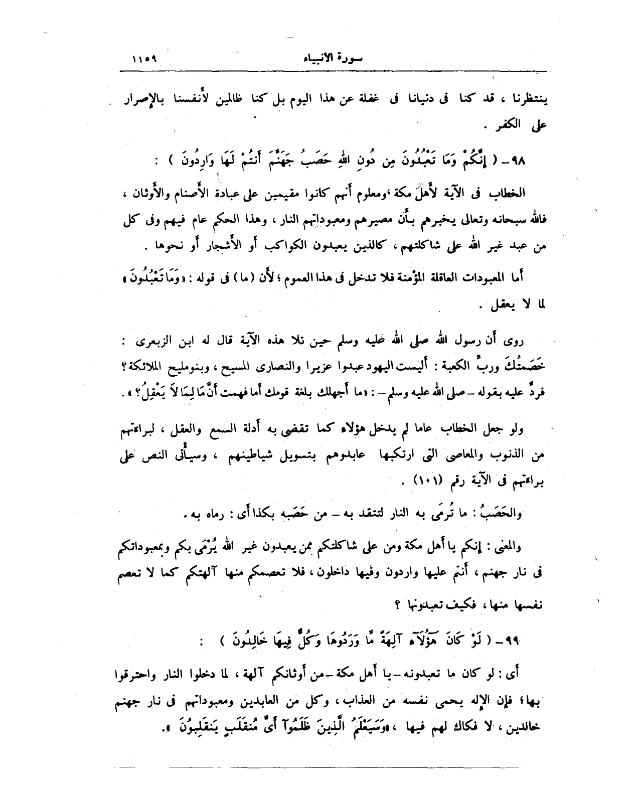 98 - {إِنَّكُمْ وَمَا تَعْبُدُونَ مِنْ دُونِ اللَّهِ حَصَبُ جَهَنَّمَ أَنْتُمْ لَهَا وَارِدُونَ}: