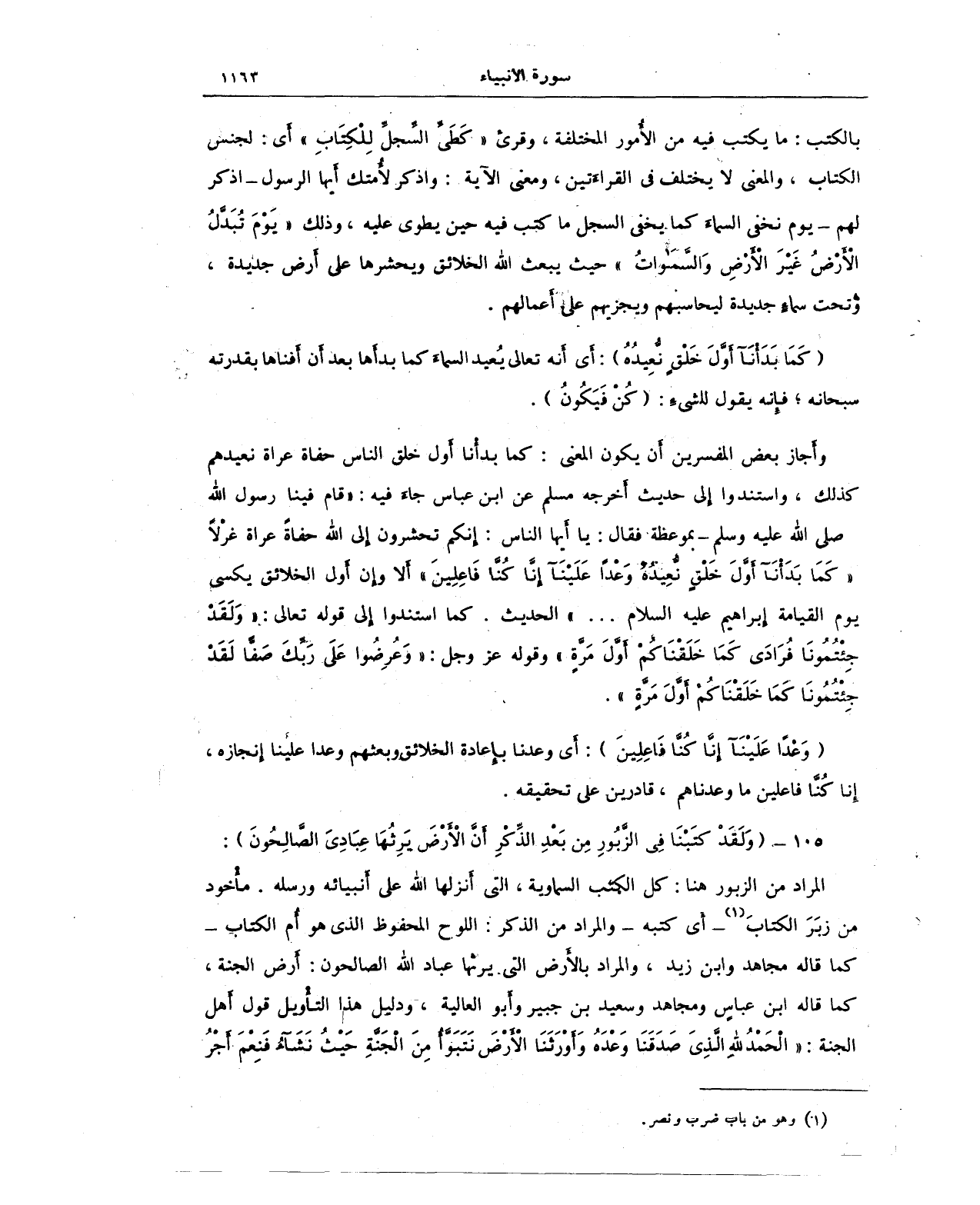 وأَجاز بعض المفسرين أَن يكون المعنى: كما بدأْنا أَول خلق الناس حفاة عراة نعيدهم كذلك، واستندوا إِلى حديث أَخرجه مسلم عن ابن عباس جاءَ فيه: "قام فينا رسول الله - صلى الله عليه وسلم - بموعظة فقال: يا أَيها الناس: إنكم تحشرون إِلى الله حفاةً عراة غرْلًا {كَمَا بَدَأْنَا أَوَّلَ خَلْقٍ نُعِيدُهُ وَعْدًا عَلَيْنَا إِنَّا كُنَّا فَاعِلِينَ} أَلا وإِن أَول الخلائق يكسى يوم القيامة إِبراهيم عليه السلام ... " الحديث. كما استندوا إلى قوله تعالى: {وَلَقَدْ جِئْتُمُونَا فُرَادَى كَمَا خَلَقْنَاكُمْ أَوَّلَ مَرَّةٍ} وقوله عز وجل: {وَعُرِضُوا عَلَى رَبِّكَ صَفًّا لَقَدْ جِئْتُمُونَا كَمَا خَلَقْنَاكُمْ أَوَّلَ مَرَّةٍ}.