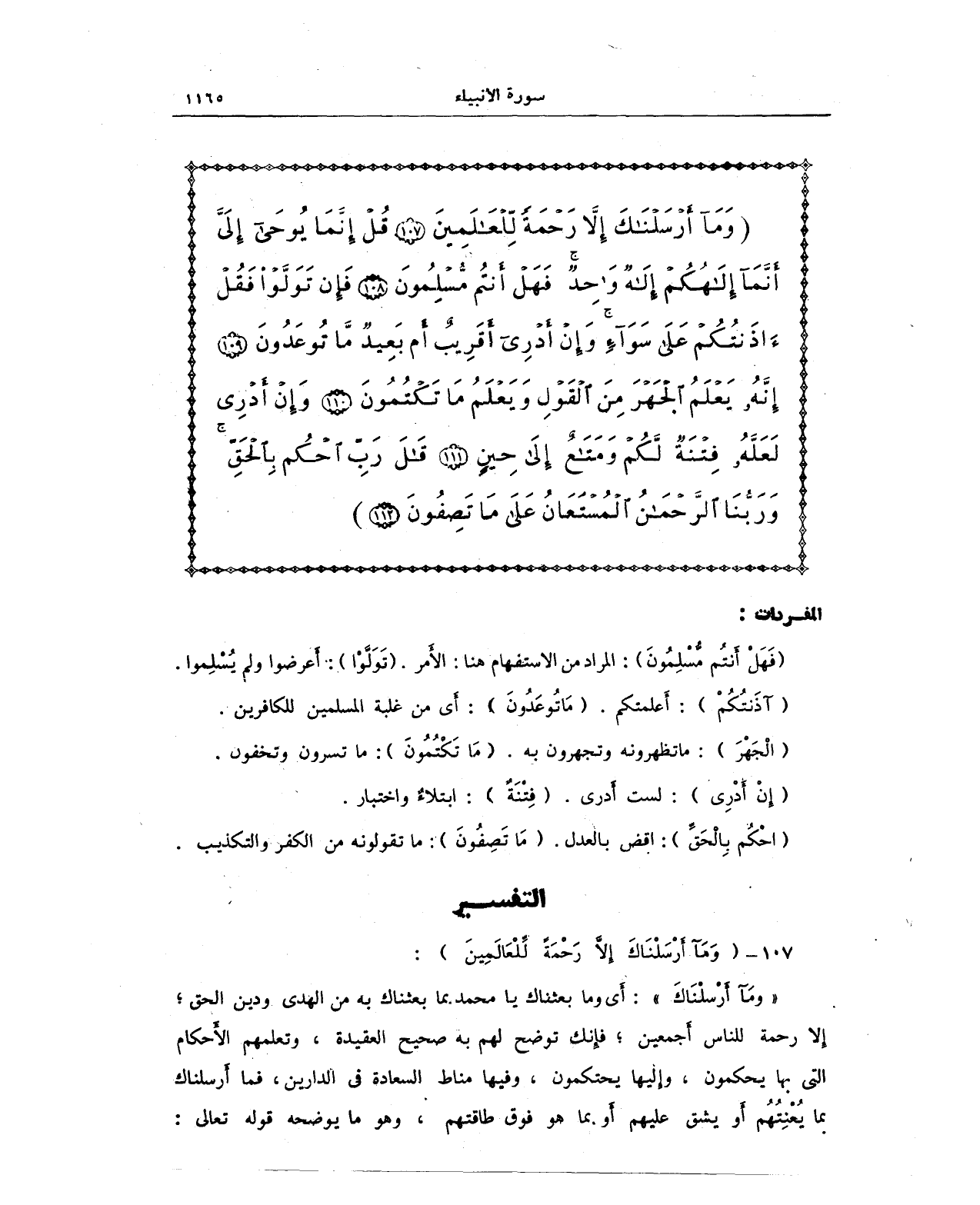 {وَمَا أَرْسَلْنَاكَ إِلَّا رَحْمَةً لِلْعَالَمِينَ (107) قُلْ إِنَّمَا يُوحَى إِلَيَّ أَنَّمَا إِلَهُكُمْ إِلَهٌ وَاحِدٌ فَهَلْ أَنْتُمْ مُسْلِمُونَ (108) فَإِنْ تَوَلَّوْا فَقُلْ آذَنْتُكُمْ عَلَى سَوَاءٍ وَإِنْ أَدْرِي أَقَرِيبٌ أَمْ بَعِيدٌ مَا تُوعَدُونَ (109) إِنَّهُ يَعْلَمُ الْجَهْرَ مِنَ الْقَوْلِ وَيَعْلَمُ مَا تَكْتُمُونَ (110) وَإِنْ أَدْرِي لَعَلَّهُ فِتْنَةٌ لَكُمْ وَمَتَاعٌ إِلَى حِينٍ (111) قَالَ رَبِّ احْكُمْ بِالْحَقِّ وَرَبُّنَا الرَّحْمَنُ الْمُسْتَعَانُ عَلَى مَا تَصِفُونَ (112)}