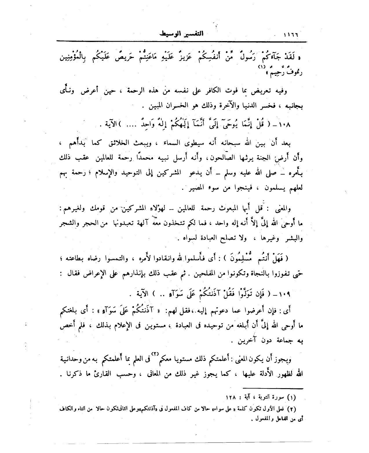 108 - {قُلْ إِنَّمَا يُوحَى إِلَيَّ أَنَّمَا إِلَهُكُمْ إِلَهٌ وَاحِدٌ ... } الآية.